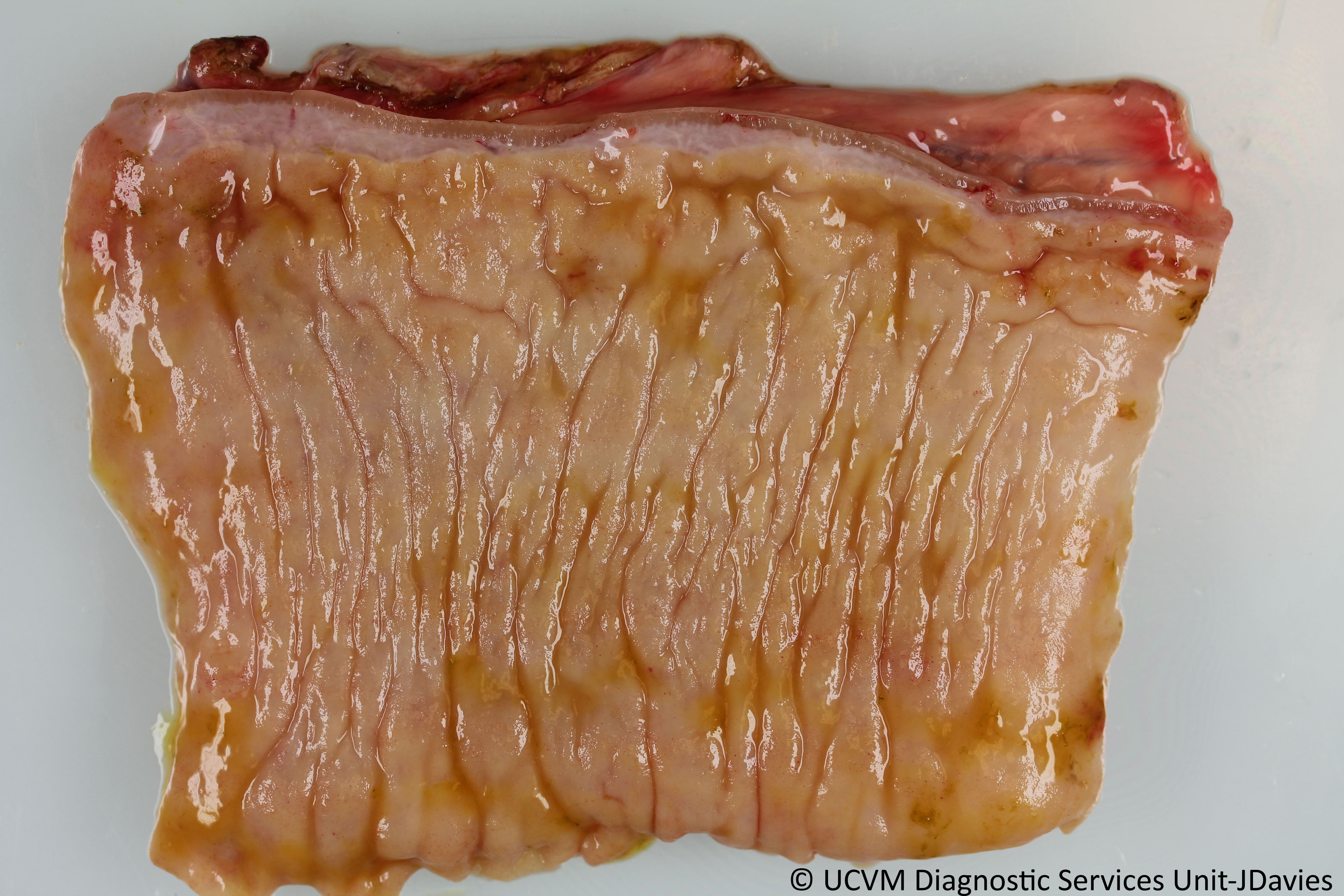 Diarrhea likely due to loss of functional mucosal surface area, ill-thrift and wasting likely due to protein-losing enteropathy