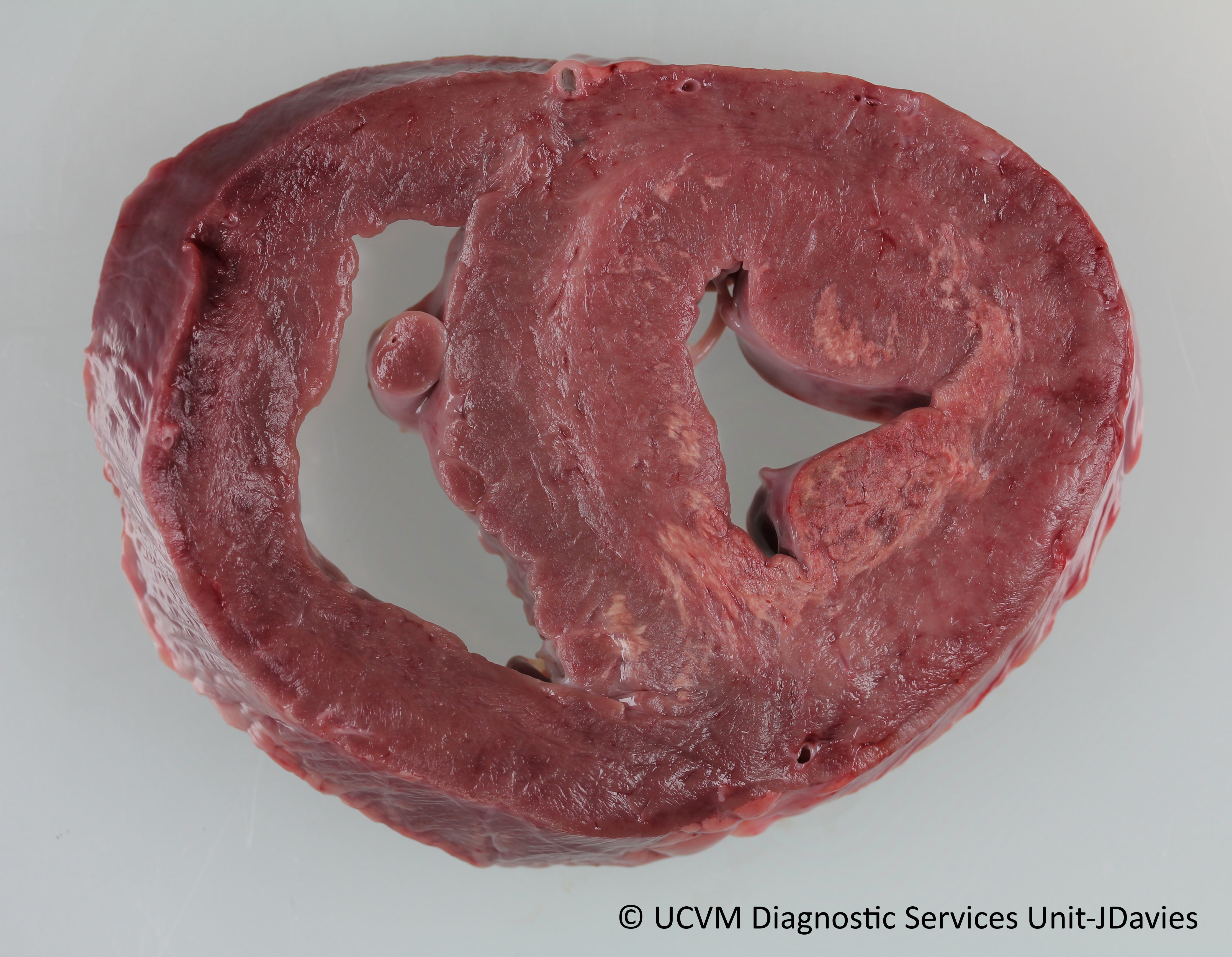 Shown: Myocardial necrosis and mineralization (White Muscle Disease) caused by Vitamin E/Selenium deficiency