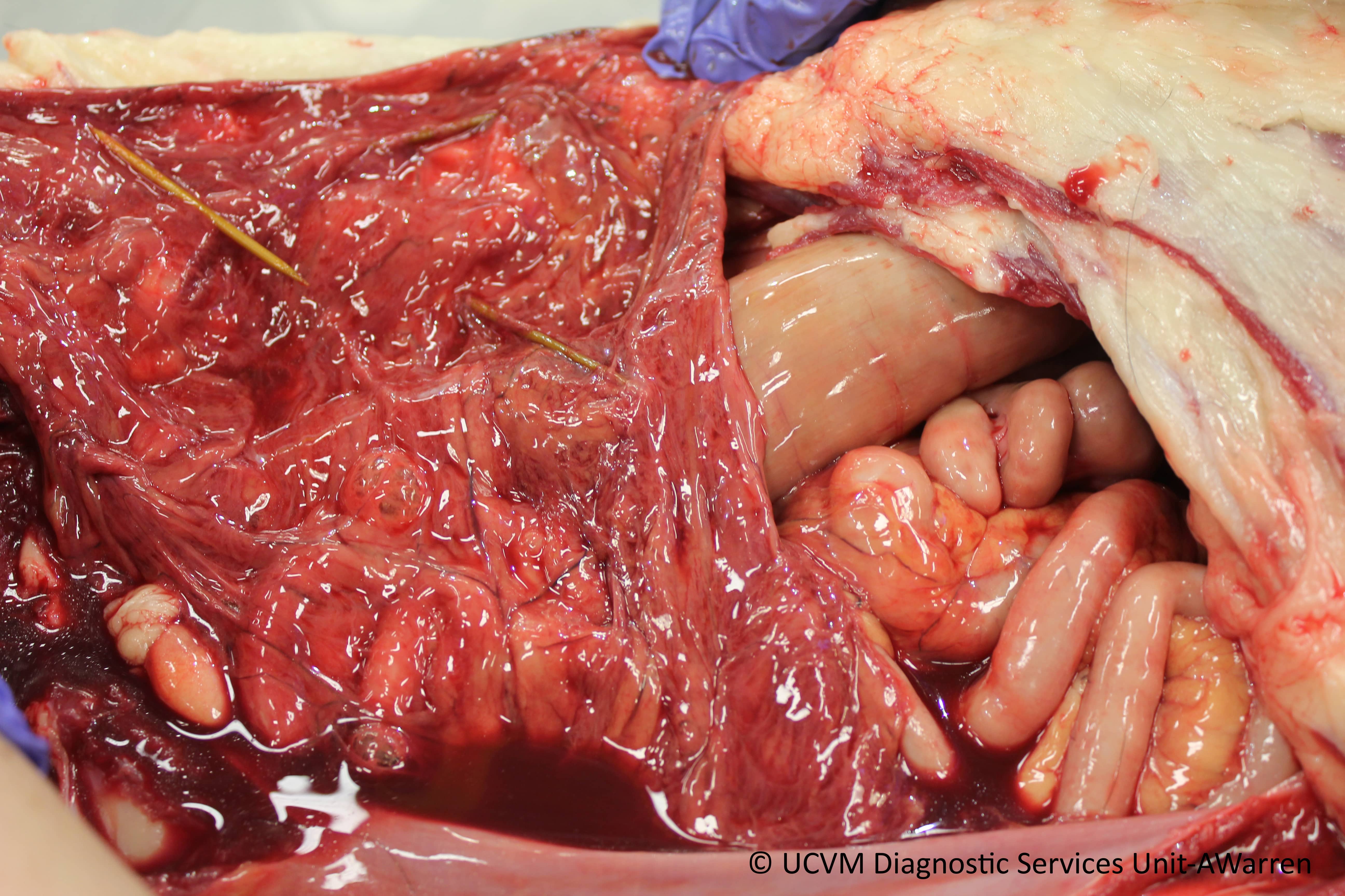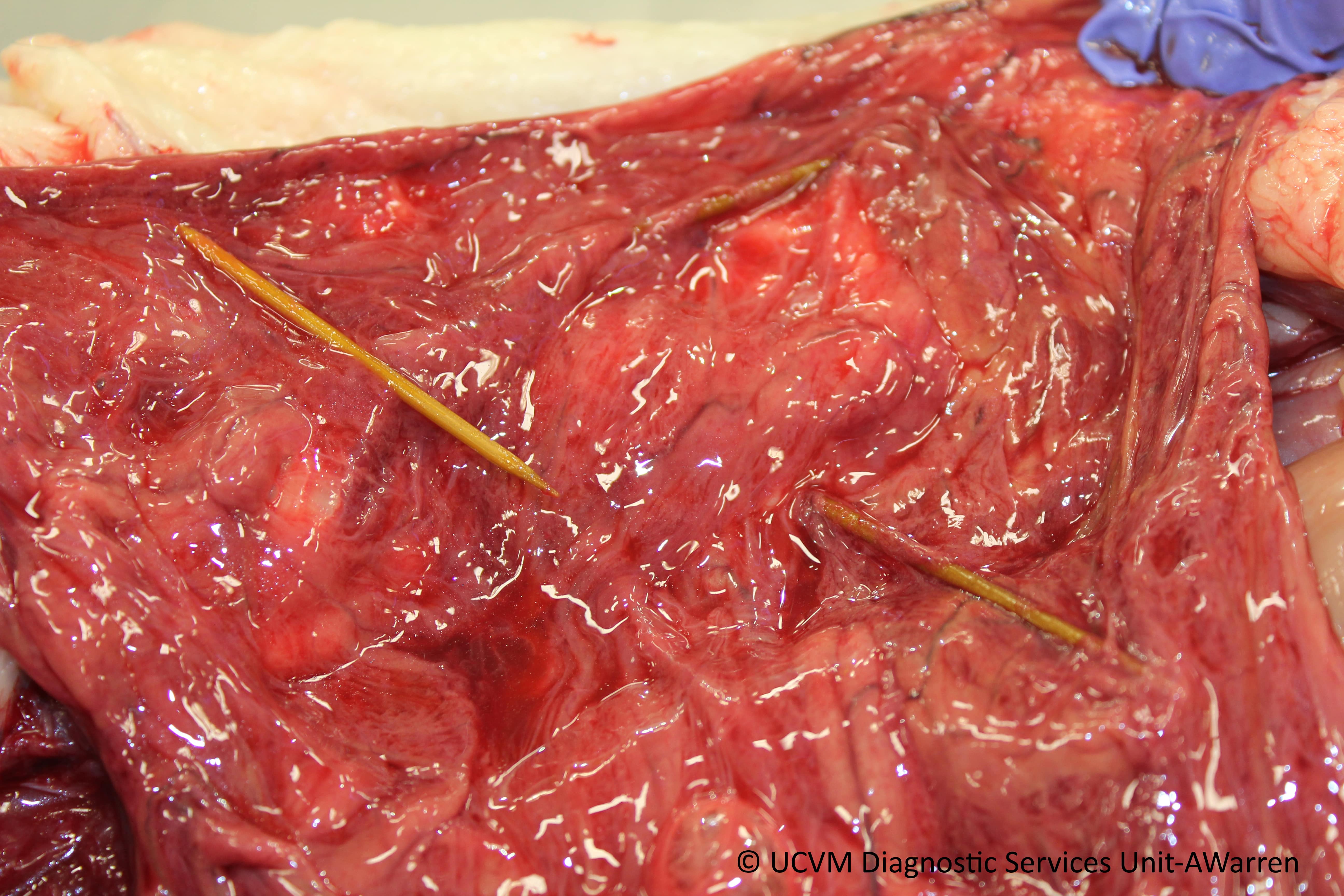 Shown: Septic peritonitis due to migrating foreign body (toothpicks)