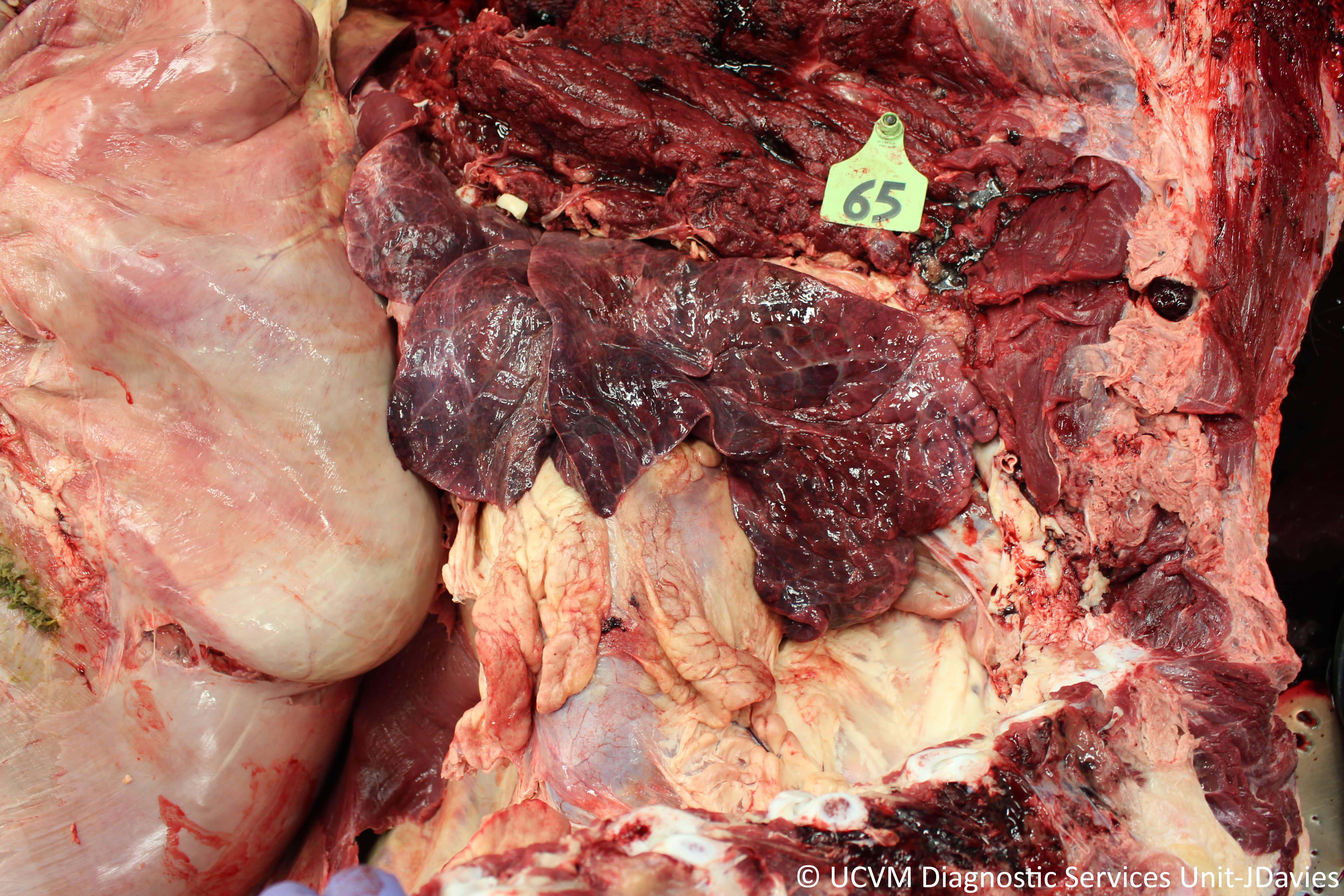 Shown: Pulmonary atelectasis secondary to primary ruminal tympany