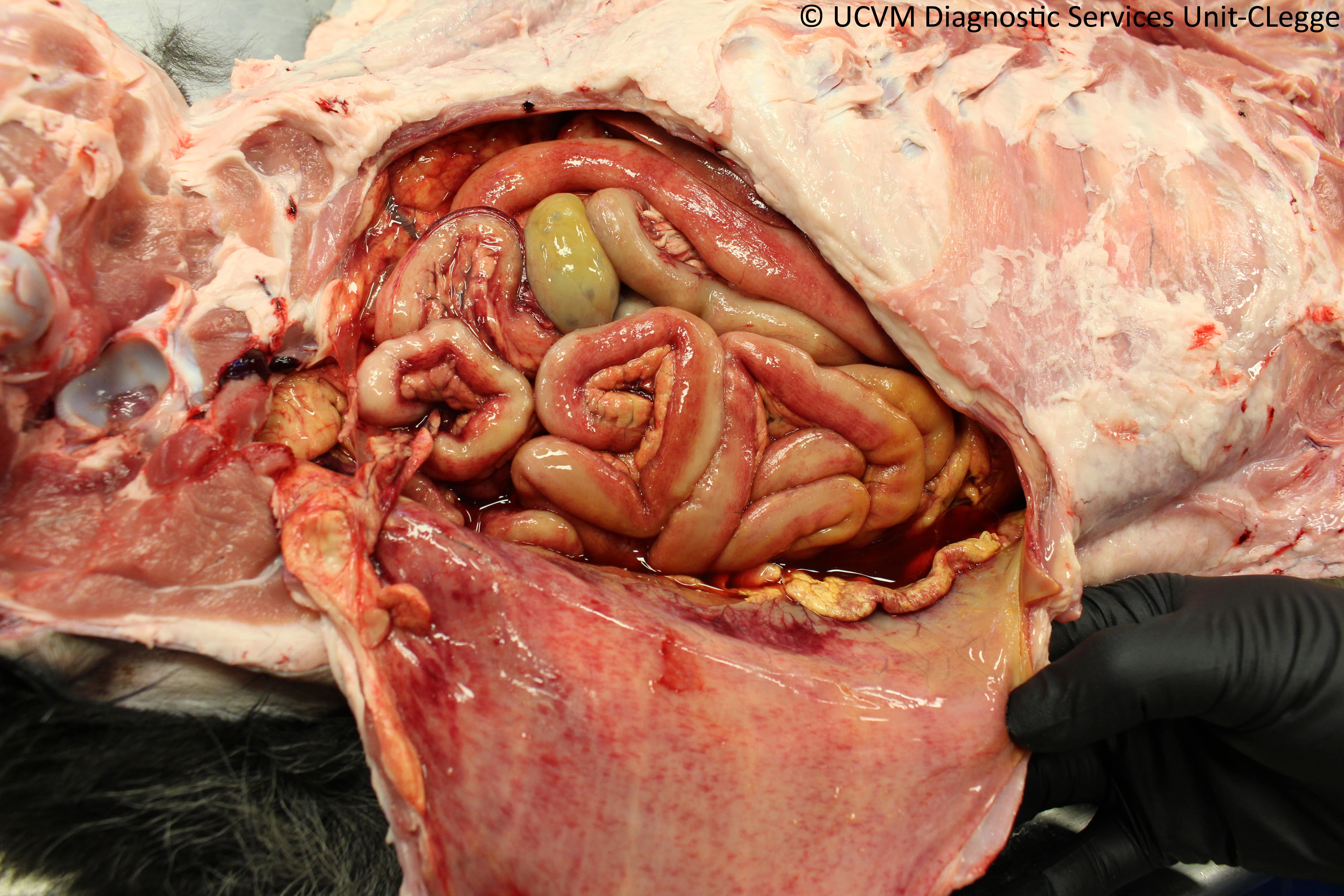 Shown: Fibrinous peritonitis, cause unknown