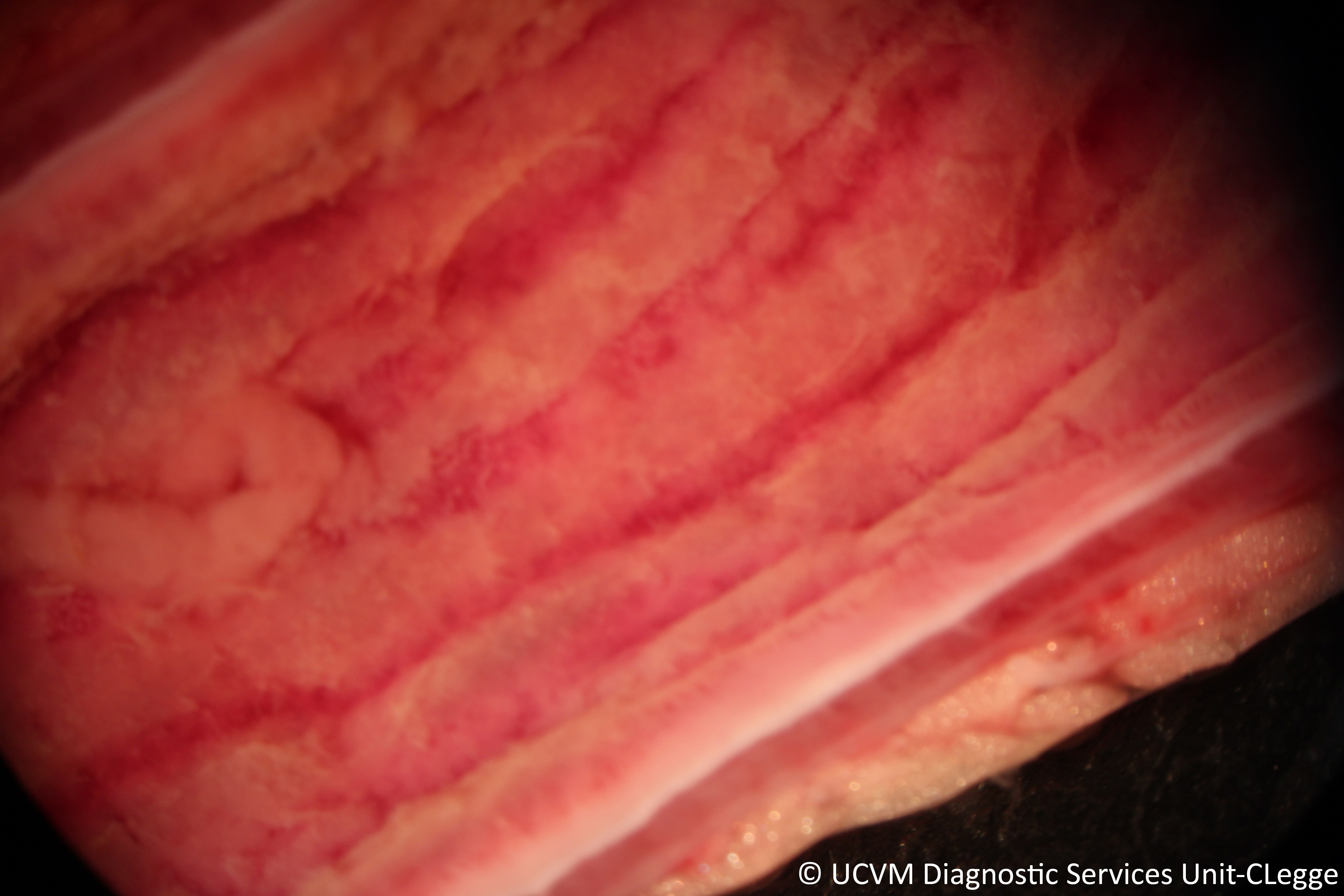 Necrotizing enteritis caused by canine parvovirus, showing lack of villi under magnification