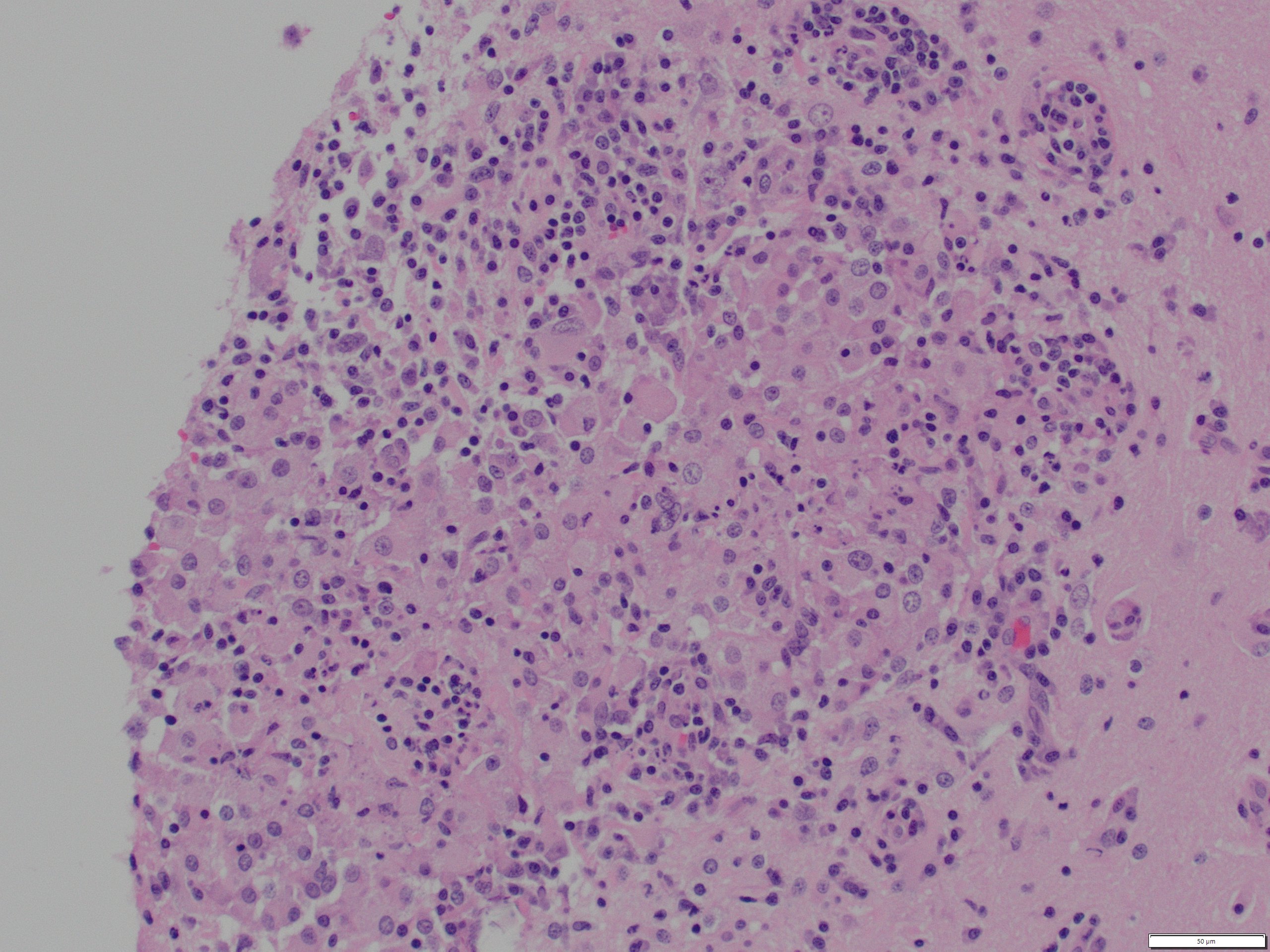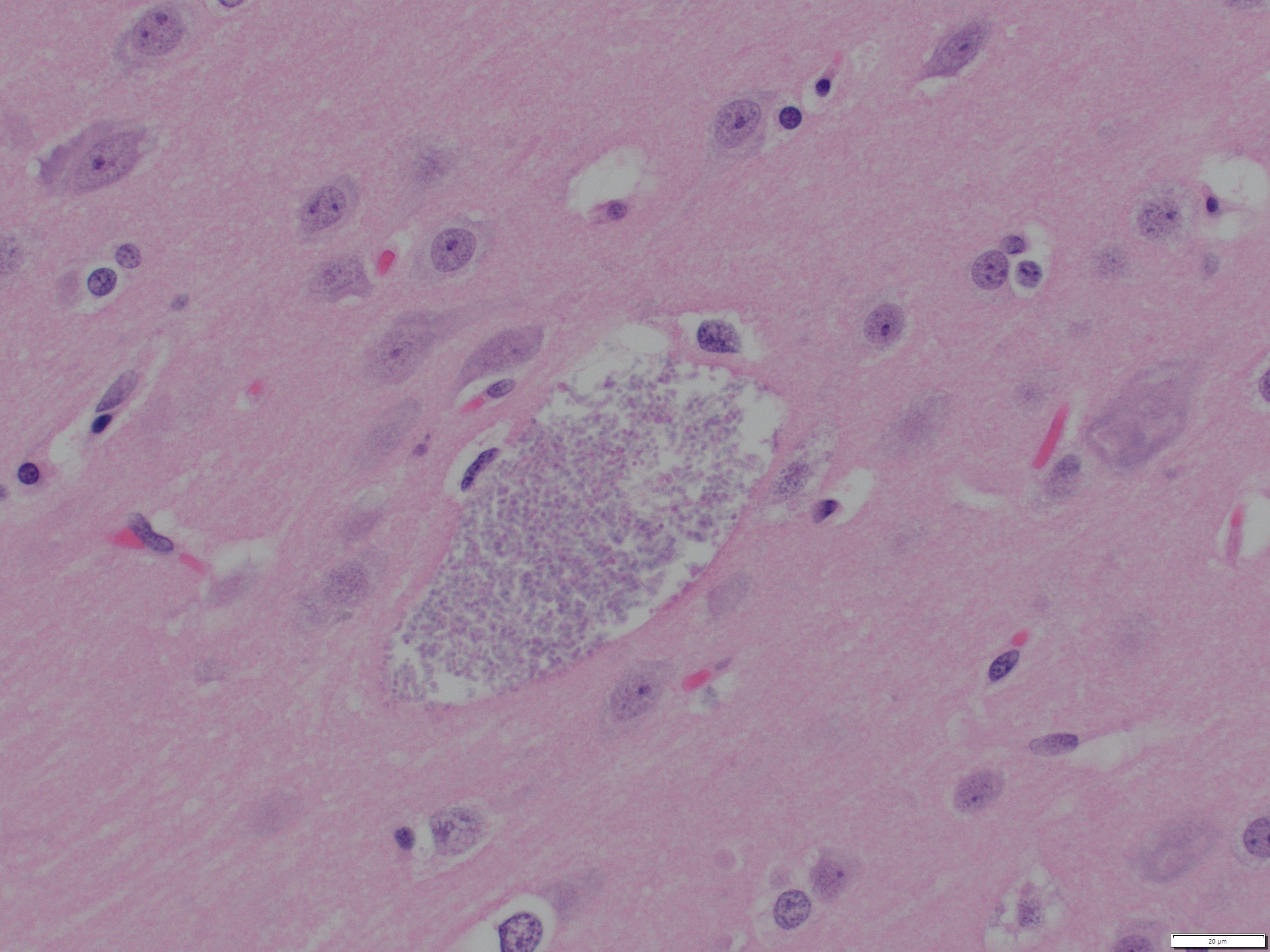 Focal granulomatous and necrotizing encephalitis with intralesional gram positive microsporidian spores.