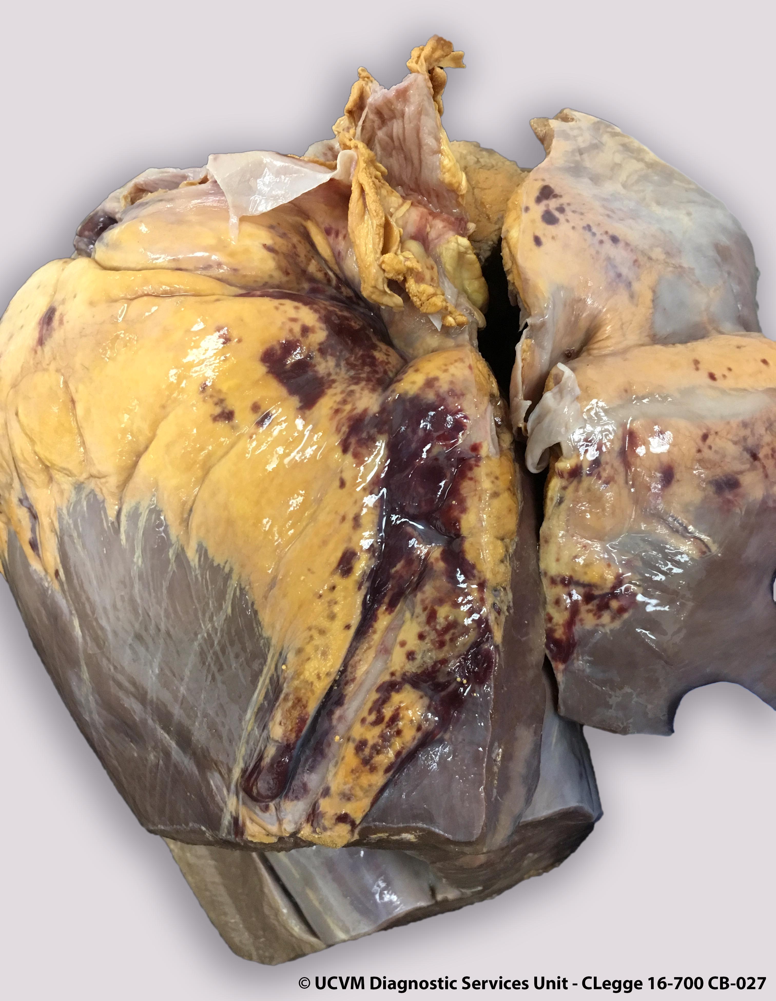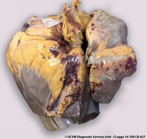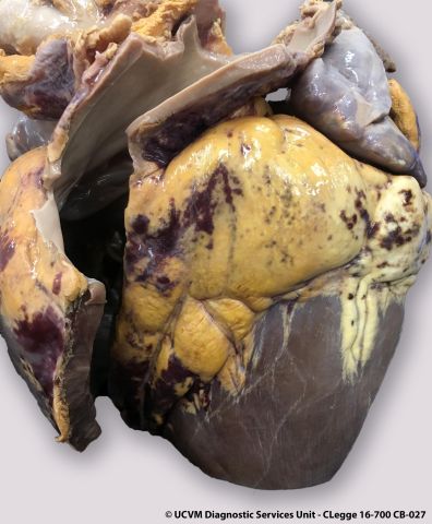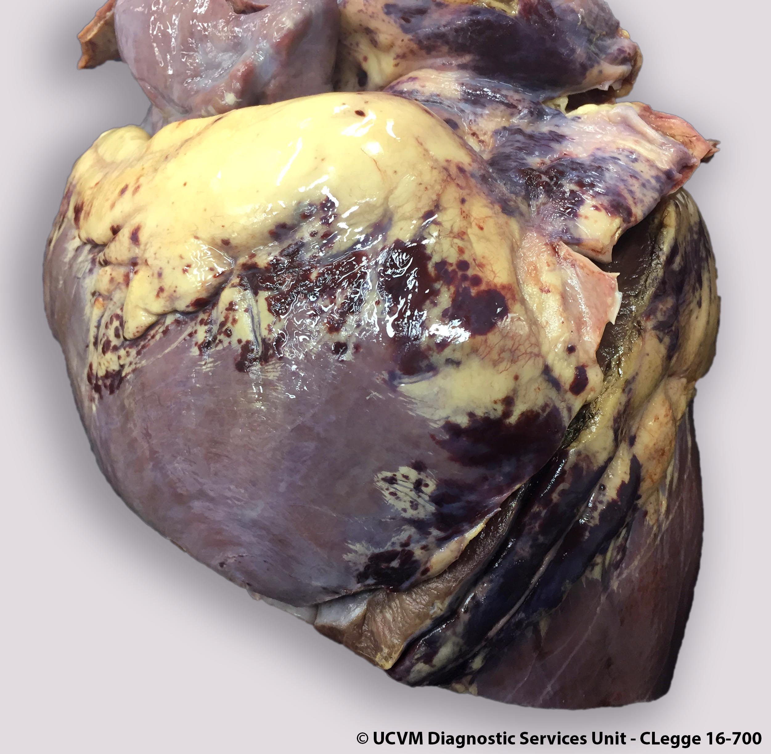 Shown: Petechial hemorrhage and myocardial necrosis secondary to septicemia