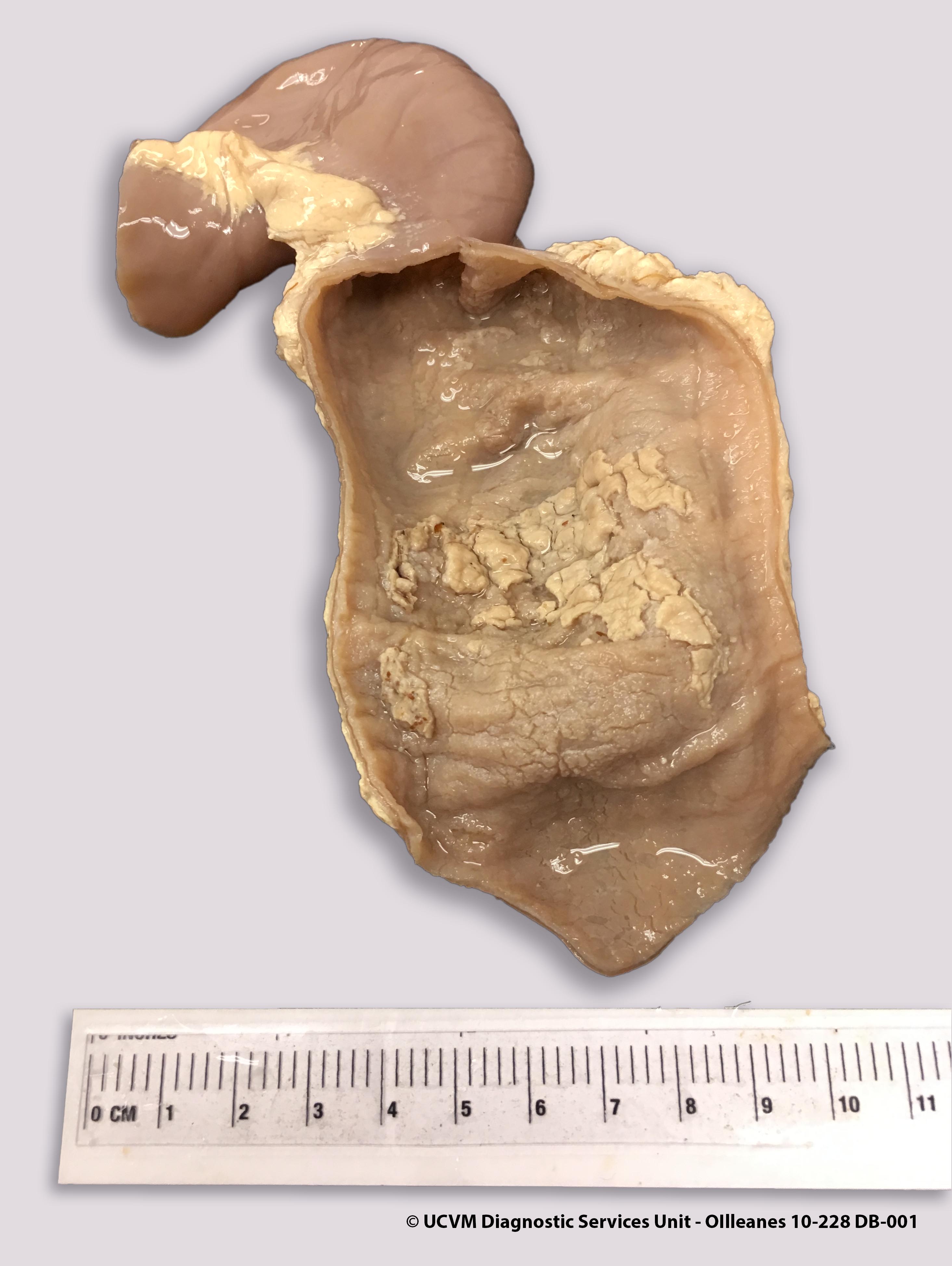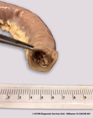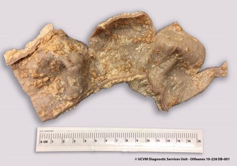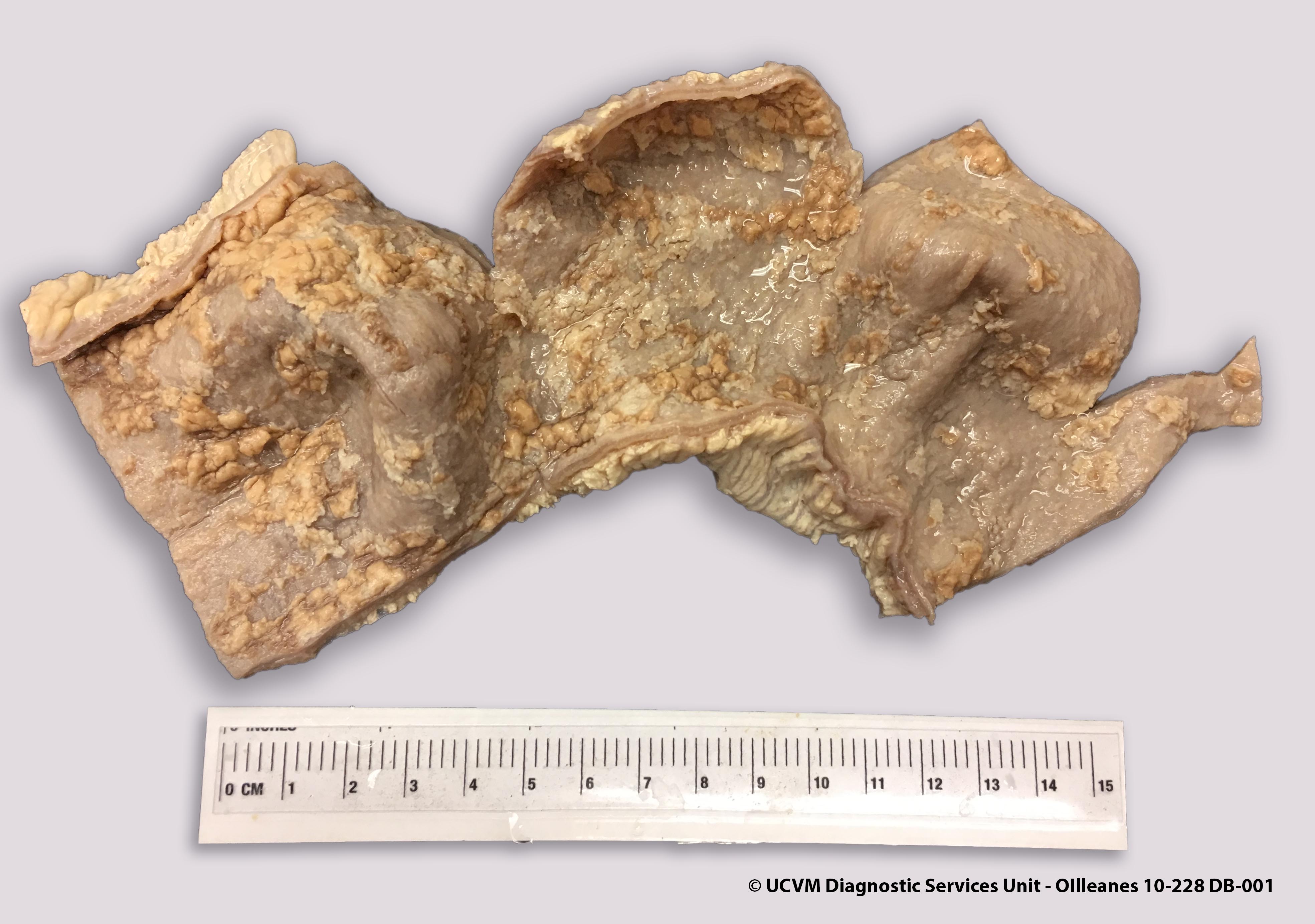 Diarrhea likely due to loss of functional mucosal surface area, ill-thrift and wasting likely due to protein-losing enteropathy