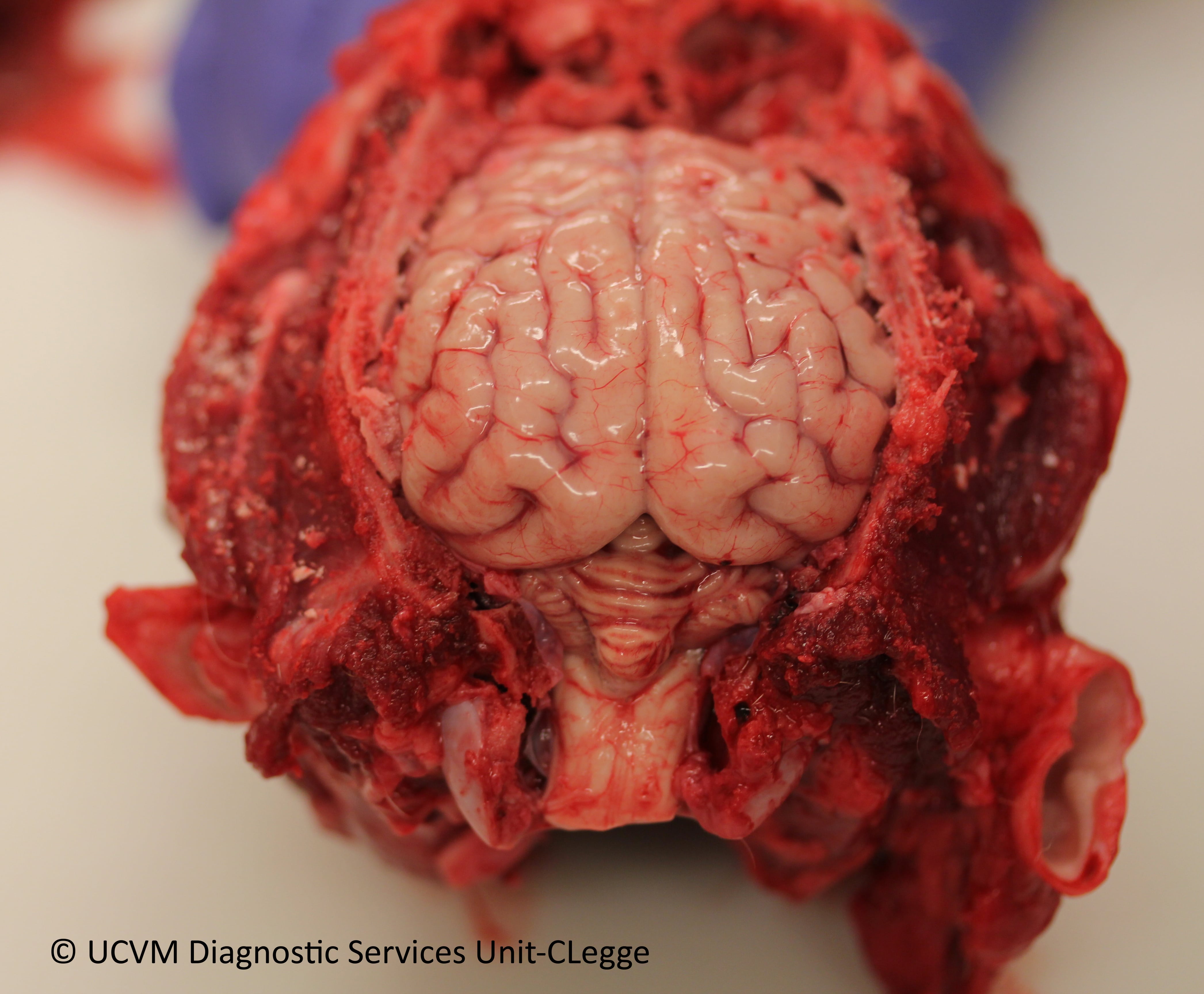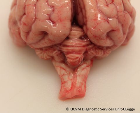 Shown: Necrotizing cerebellitis and cerebellar atrophy caused by Neospora caninum