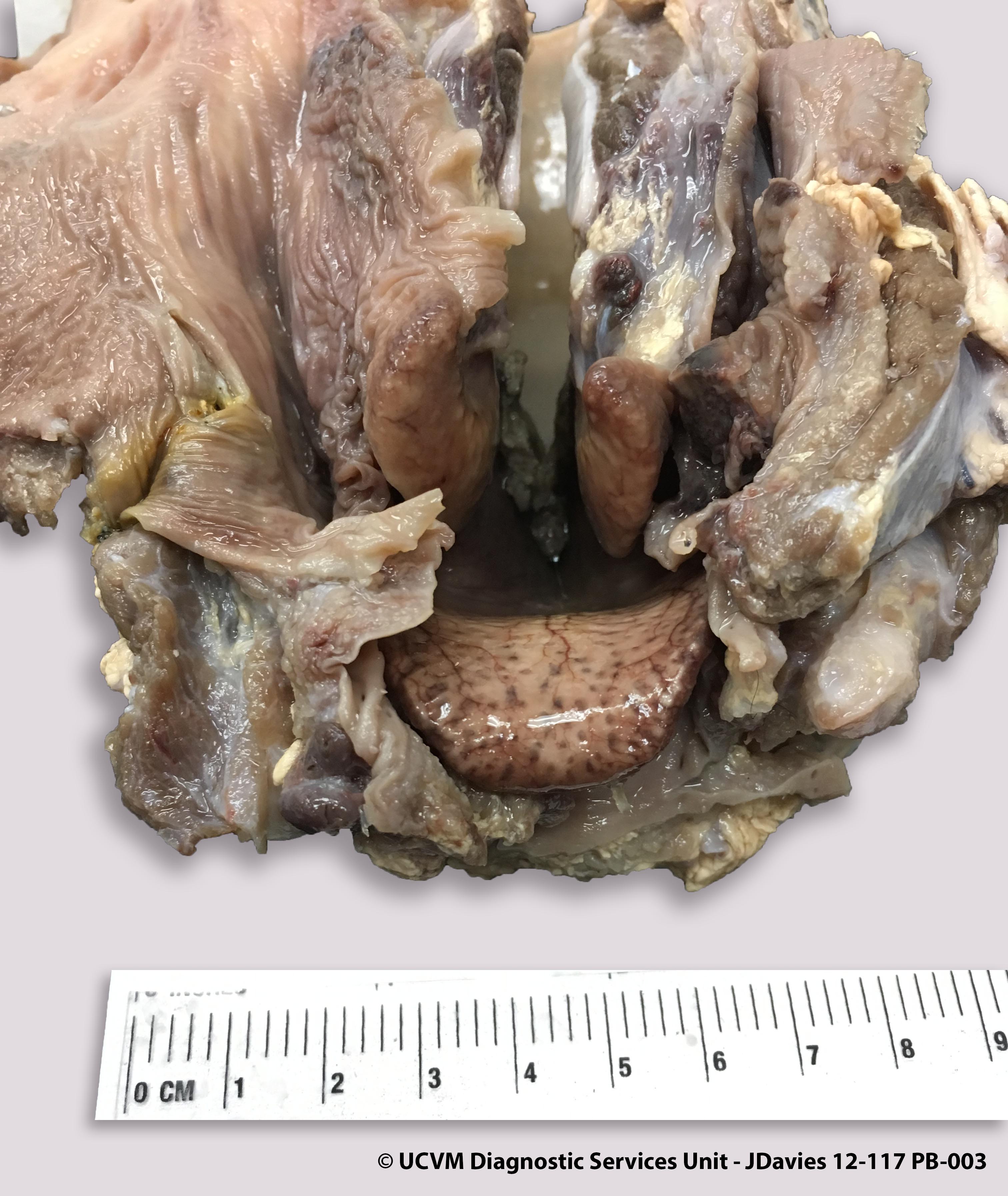 Ruminant, Bovine: Abomasum, forestomach. Emphysematous and hemorrhagic abomasitis, suspect Clostridial abomasitis.