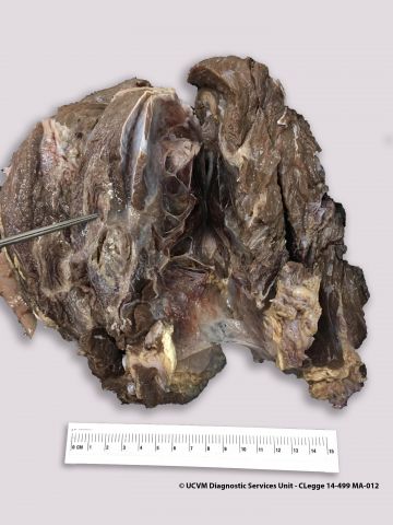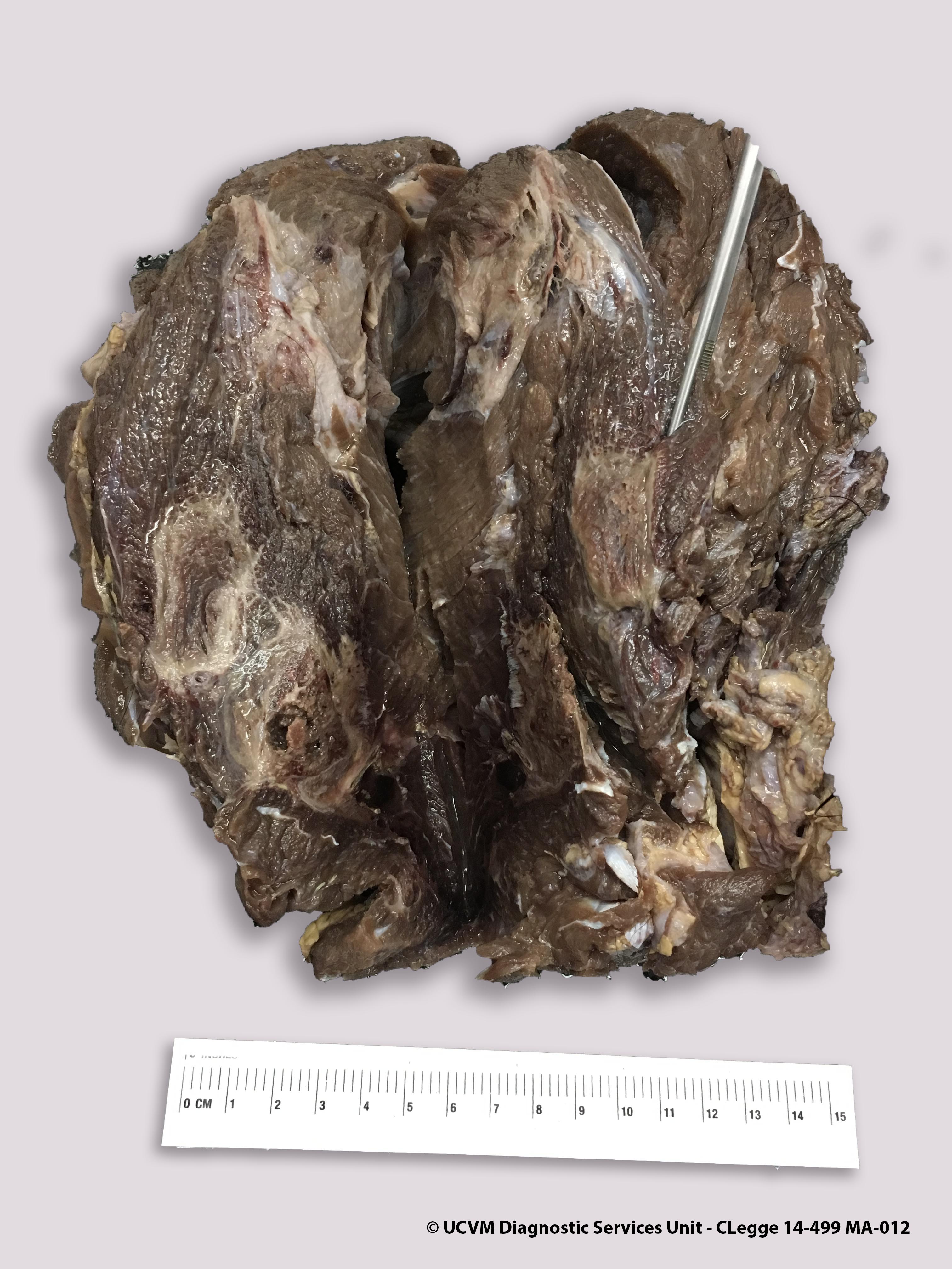 Ruminant, Bovine: Liver. Chronic passive congestion (nutmeg liver) in ionophore toxicity.