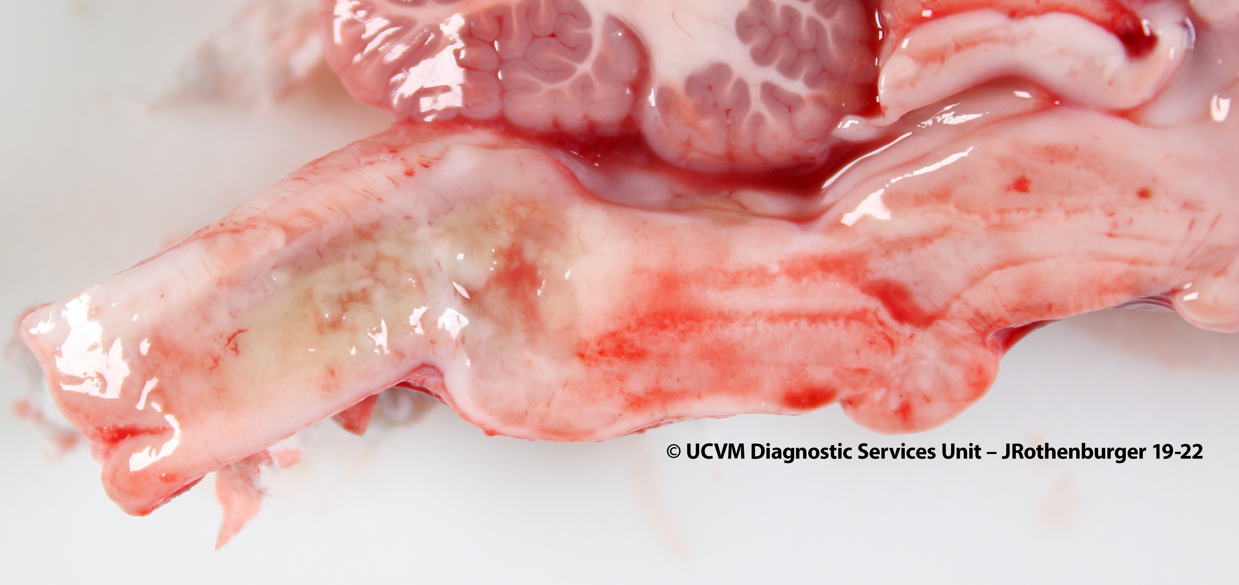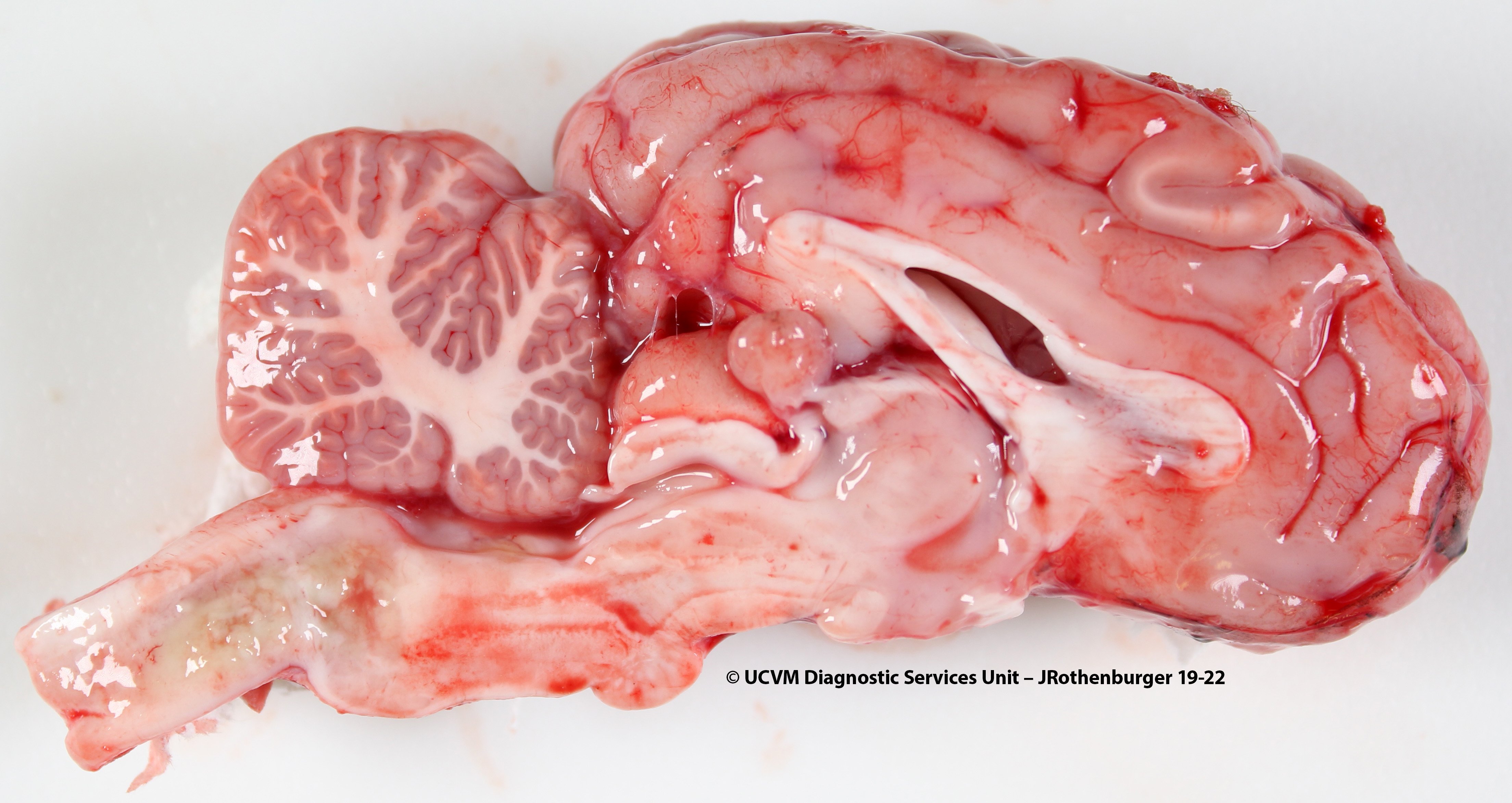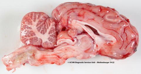 A poorly-demarcated, locally-extensive area of malacia (yellow discolouration) in the brainstem consistent with listeriosis; Listeria monocytogenes