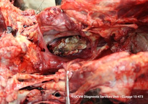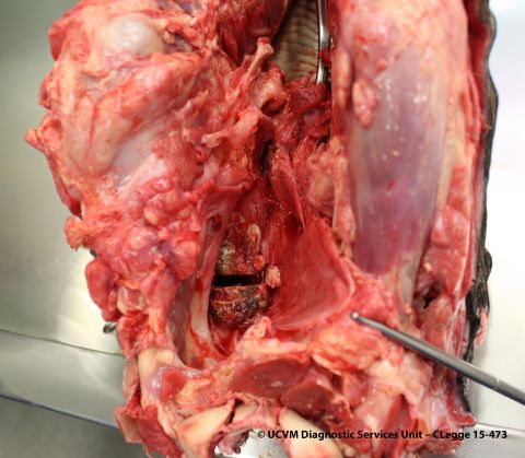 Equid, Foal: Intestines. Necrotizing and hemorrhagic enterocolitis caused by Clostridium (Clostridial enteritis).