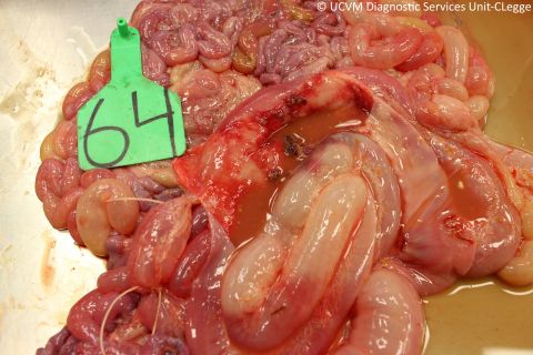 Shown: Necrotizing colitis caused by Salmonella typhimurium