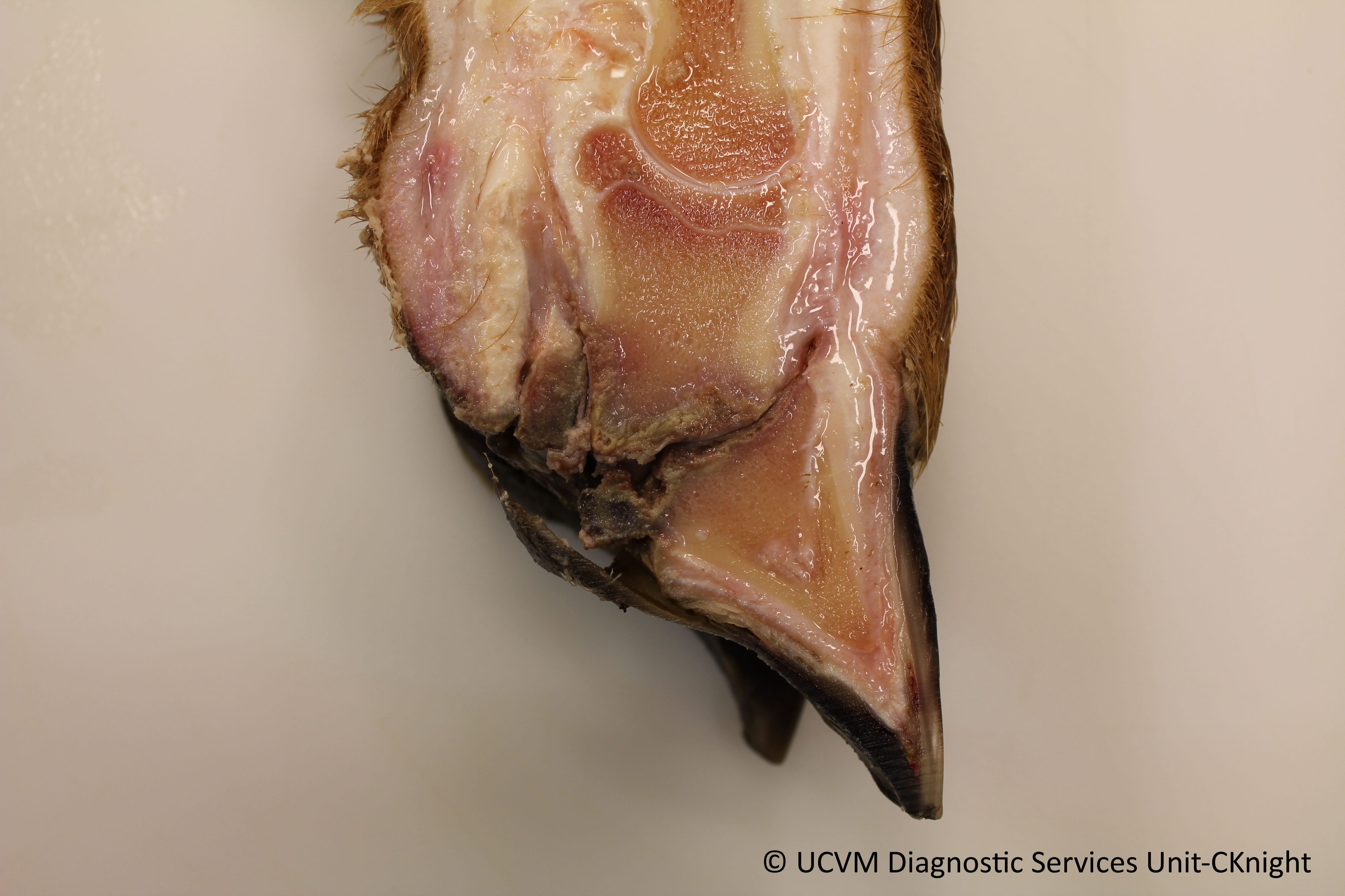 Shown: Necrosuppurative distal interphalangeal arthritis, osteonecrosis and heel bulb ulceration