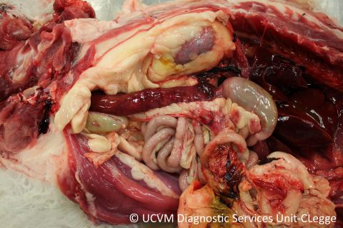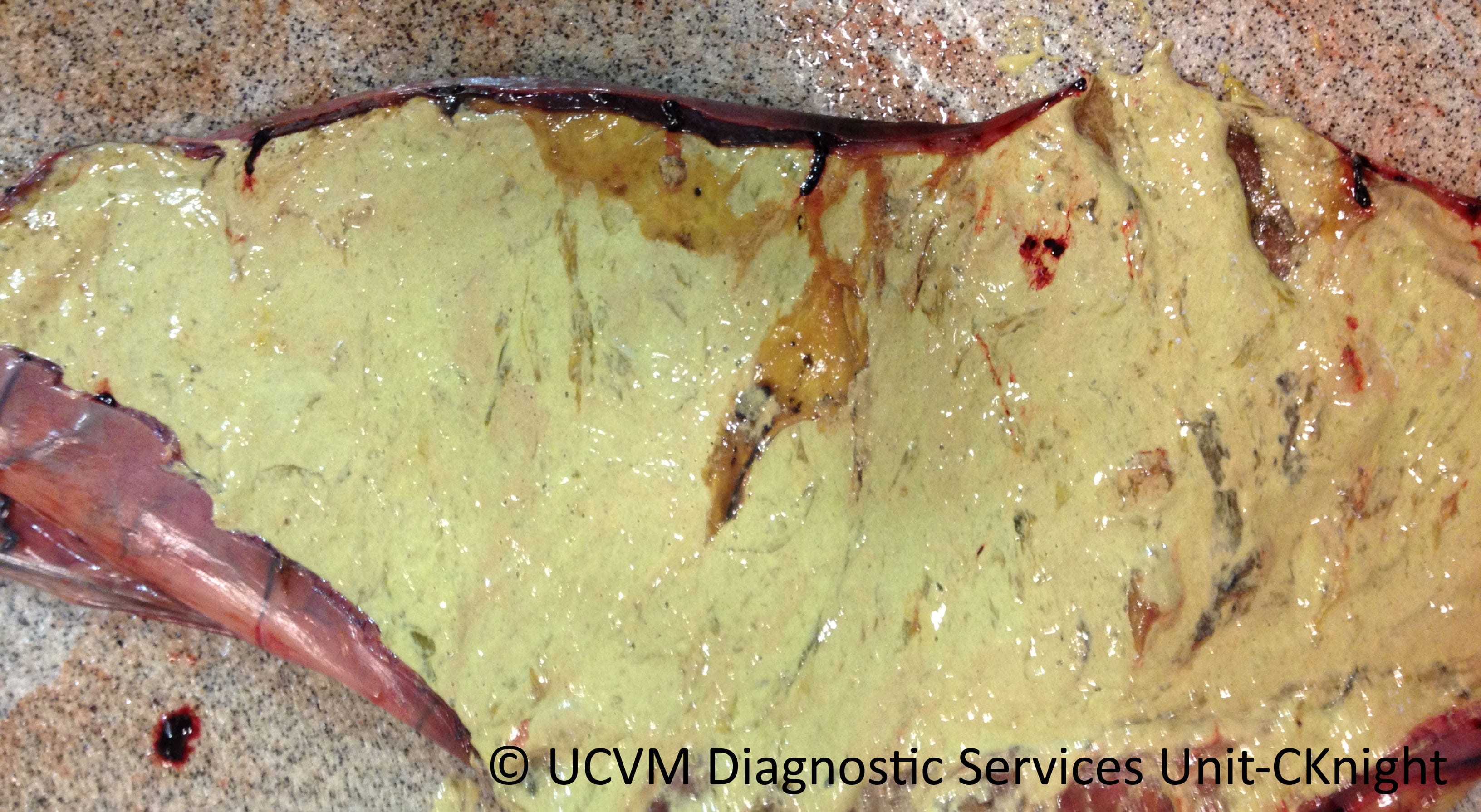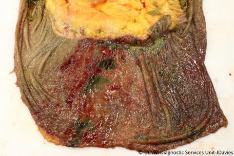 Necrotizing colitis with Clostridium difficile, the white material is Bio-Sponge