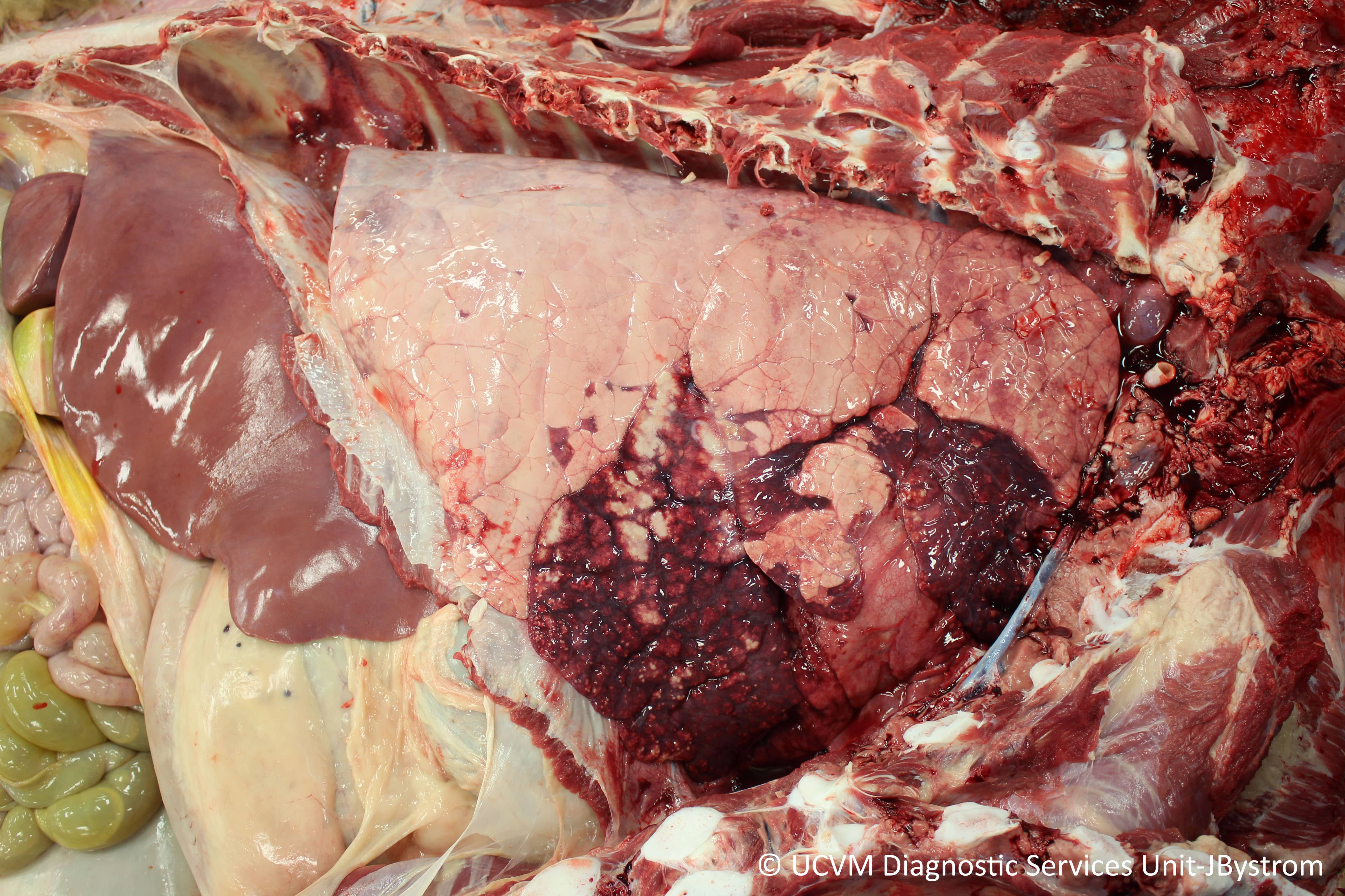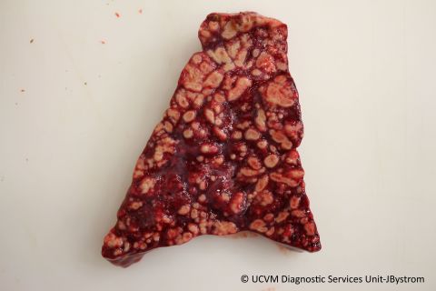 Pneumonia: Firm, plum-coloured cranioventral consolidation with numerous caseonecrotic abscesses and sequestra