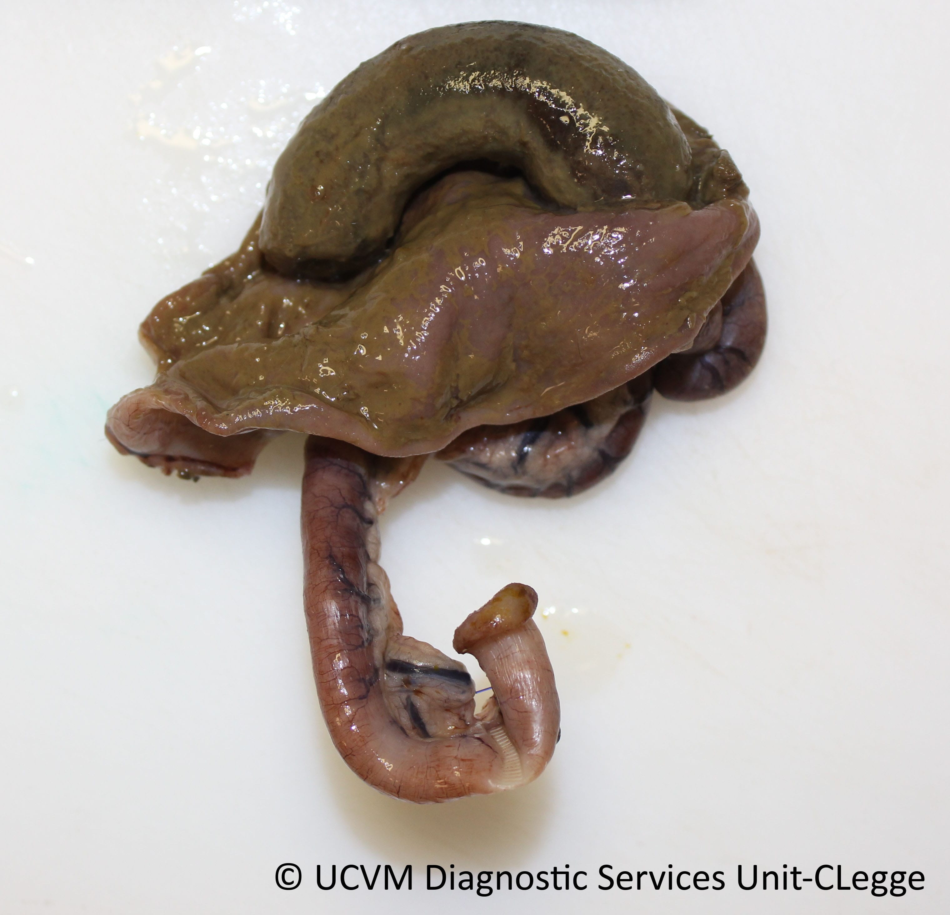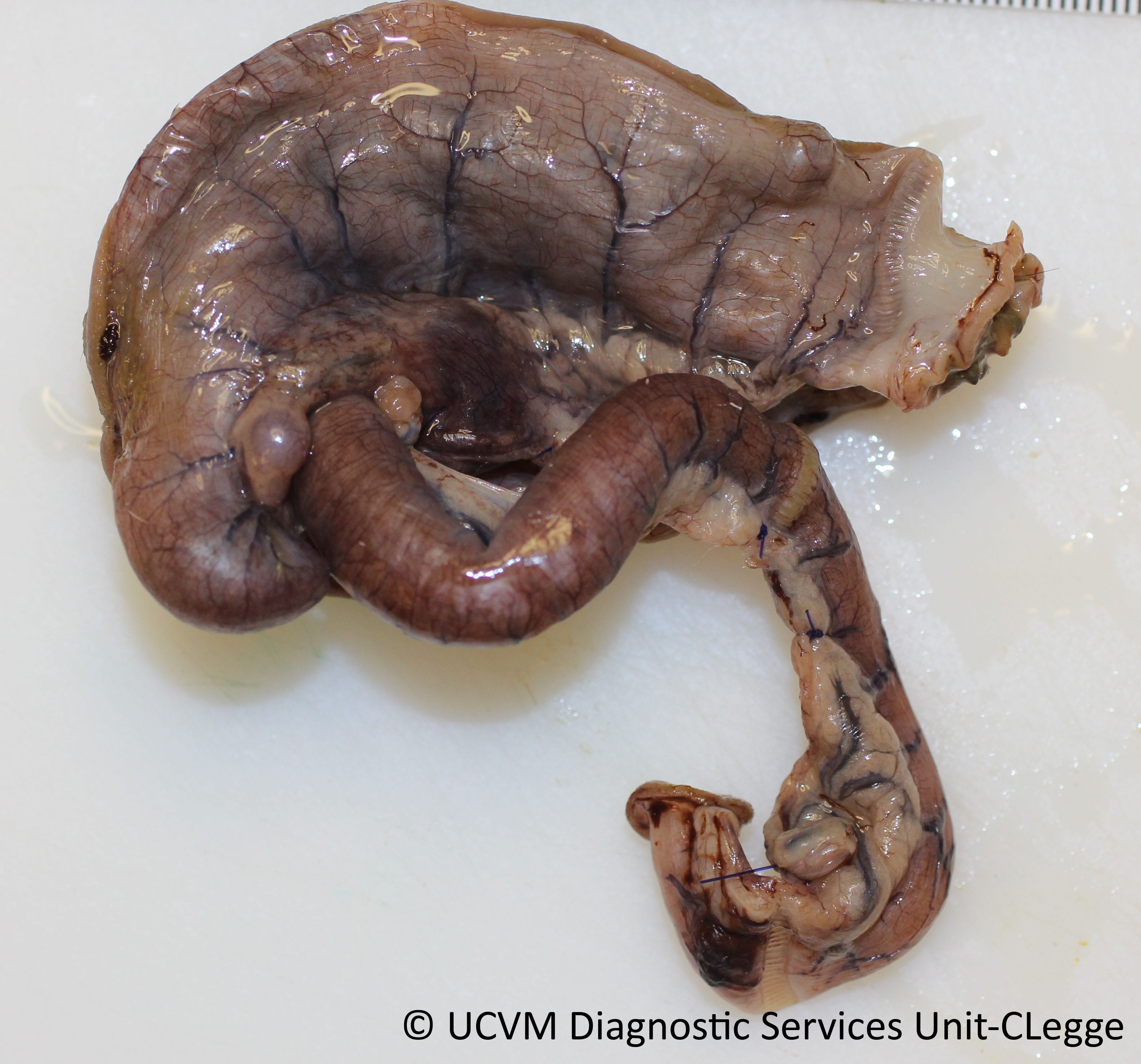 Ruminant, Bovine (calf): Small intestine. Undifferentiated neonatal diarrhea caused by enterotoxigenic Escherichia coli.