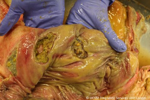 Pneumonia: Cranioventral fibrinous bronchopneumonia with foci of coagulative necrosis