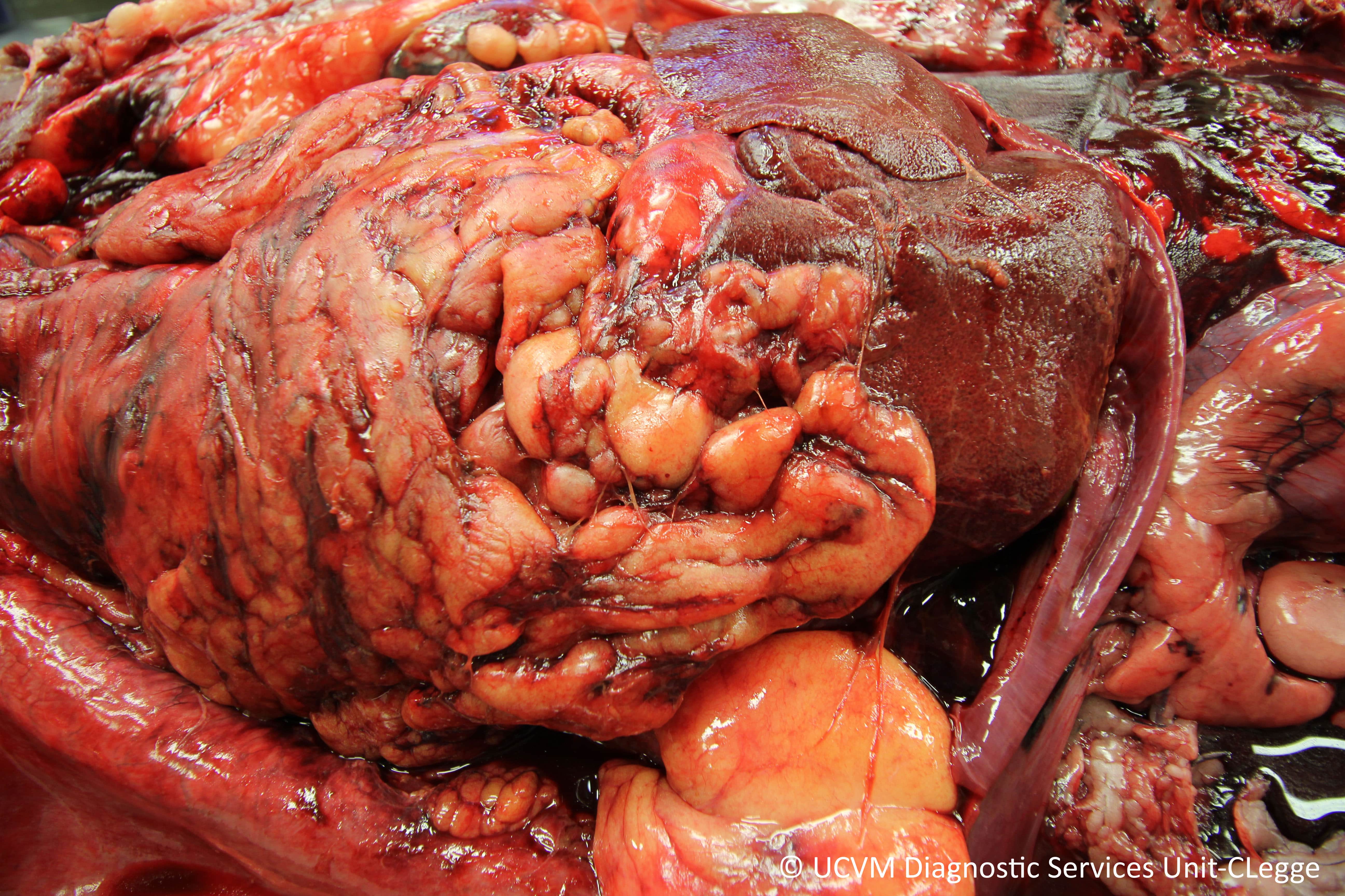 Shown: Fibrinosuppurative peritonitis from intestinal perforation