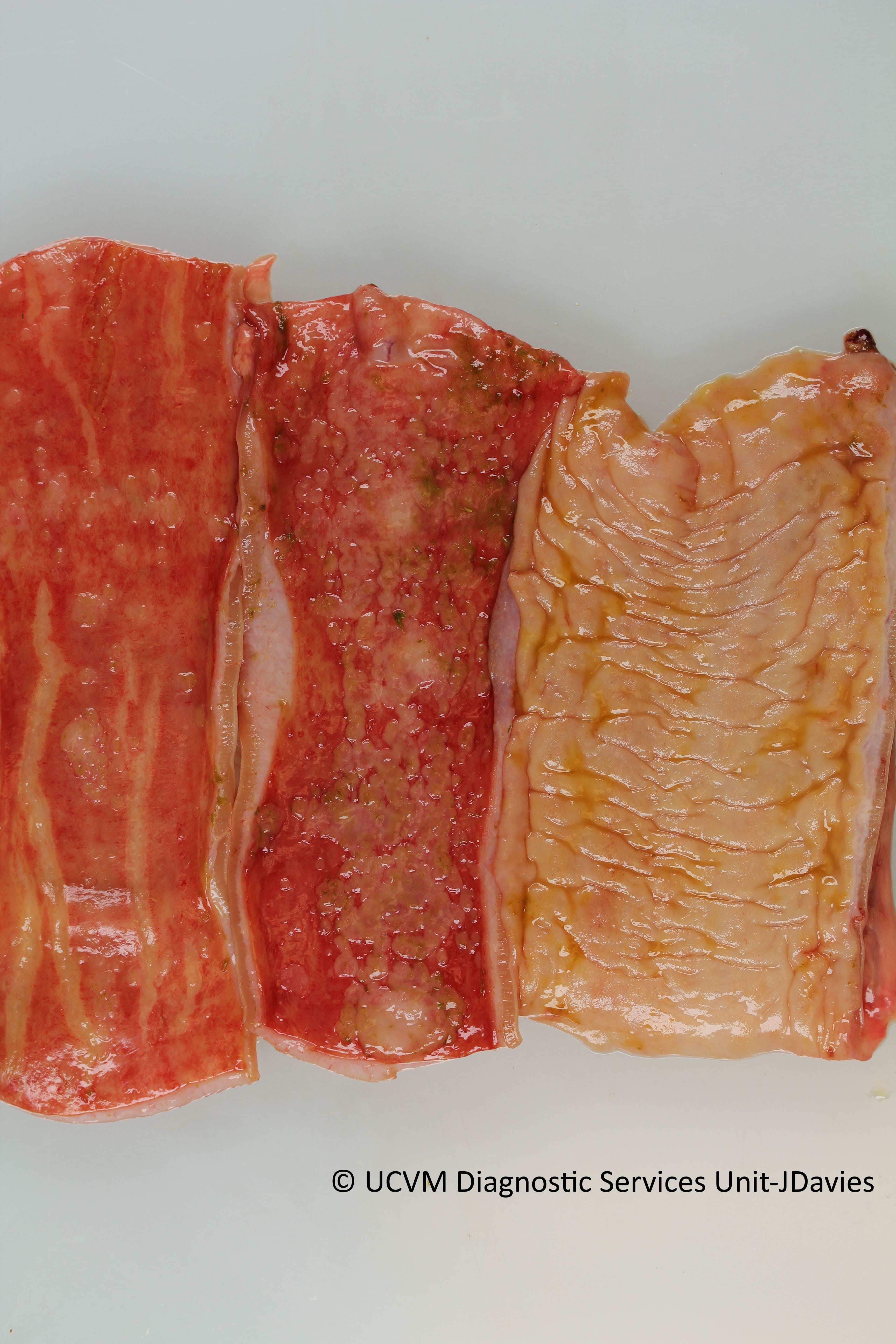 Diarrhea likely due to loss of functional mucosal surface area, ill-thrift and wasting likely due to protein-losing enteropathy