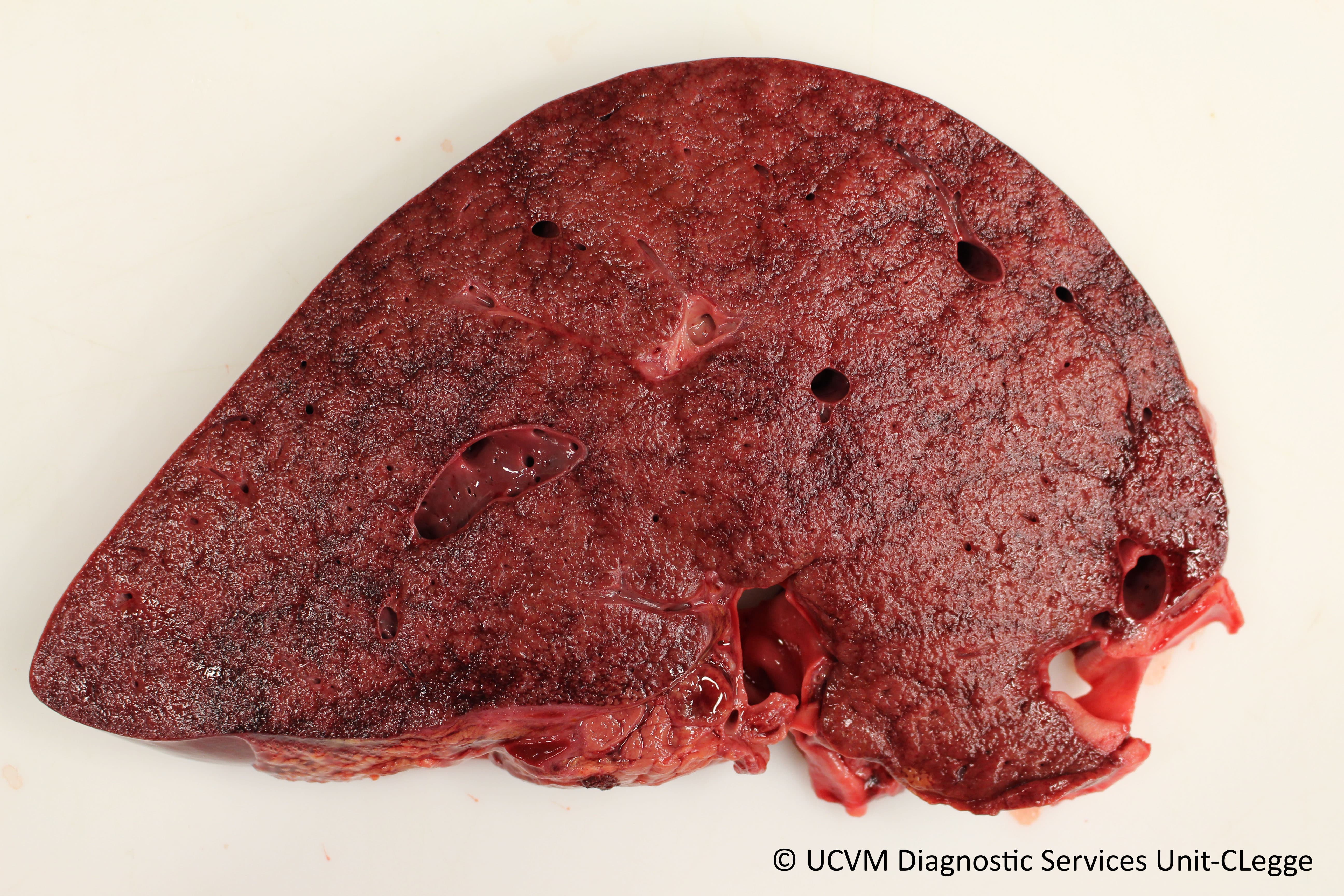 Chronic passive congestion (nutmeg liver) due to right-sided heart failure in ionophore (monensin) toxicity