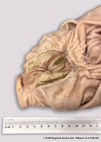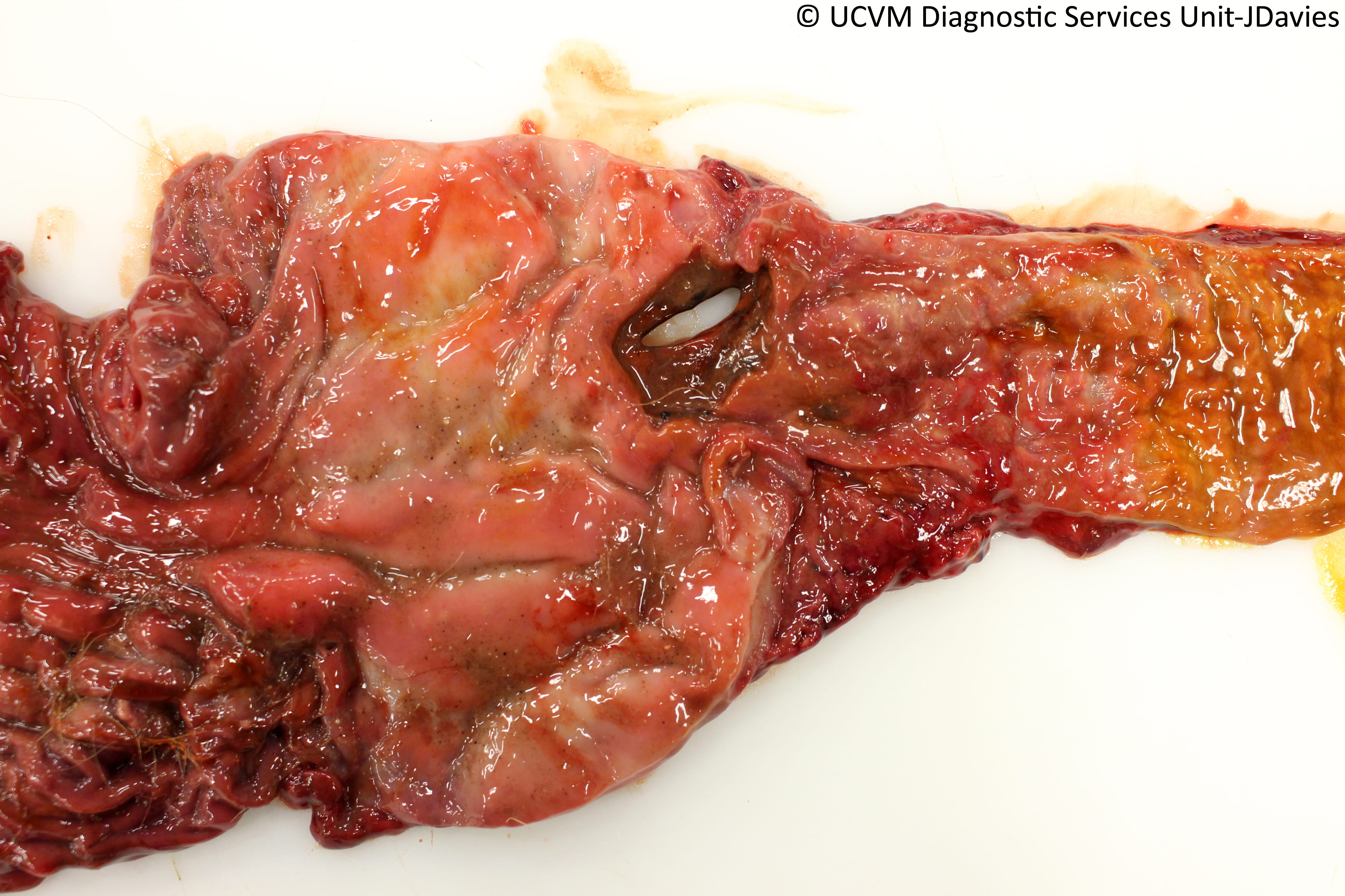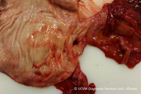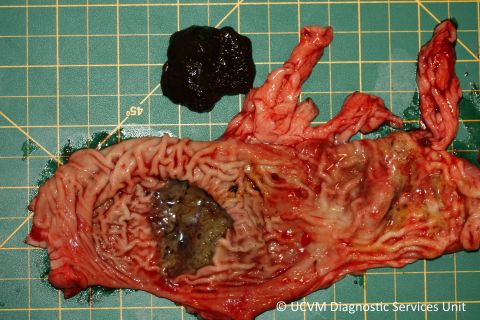 Shown: Perforating gastric ulcer due to NSAID toxicity