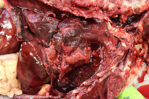 Fibrinosuppurative pleuritis (pyothorax) with foreign material, secondary to esophageal perforation
