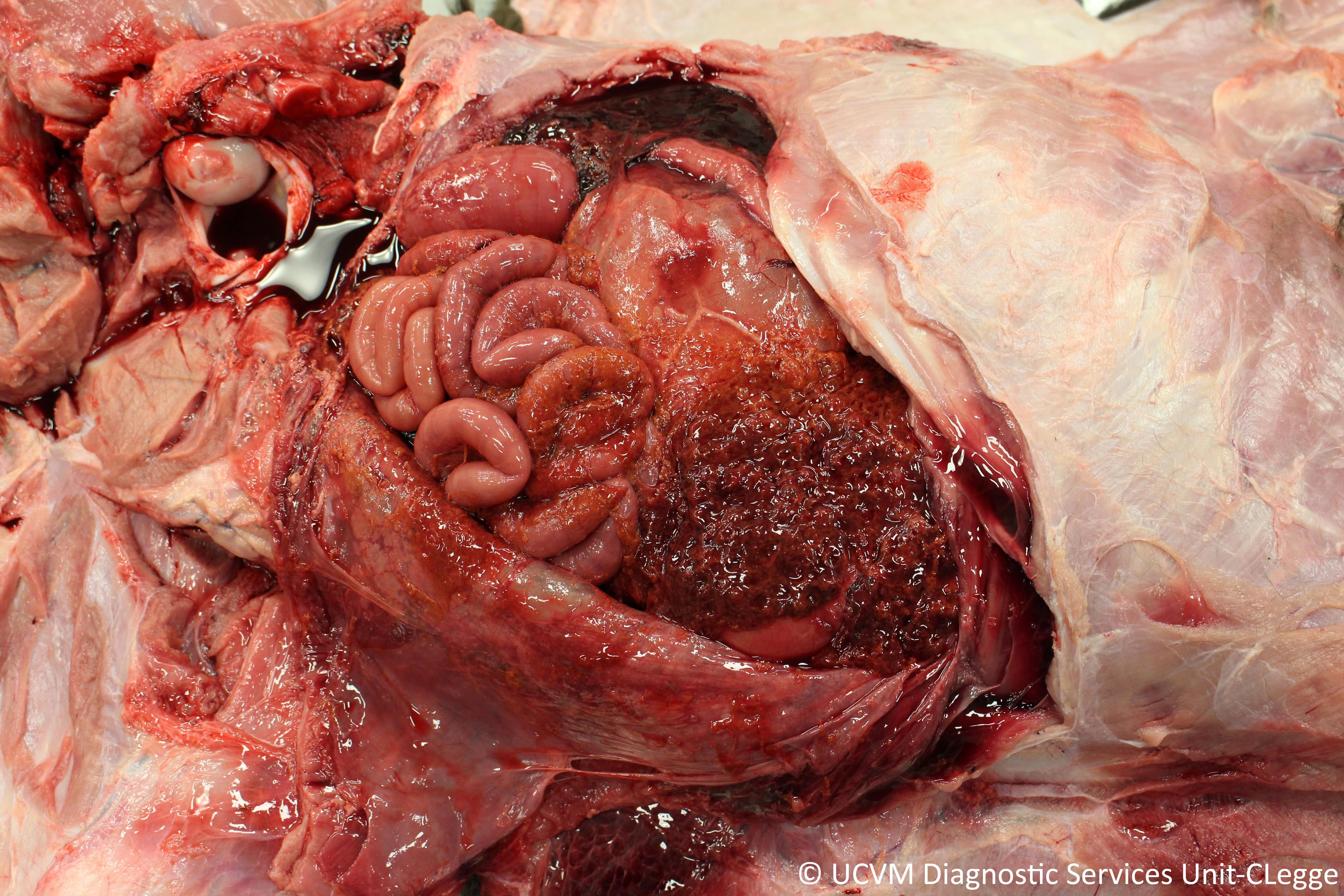 Shown: Fibrinosuppurative peritonitis secondary to Escherichia coli septicemia