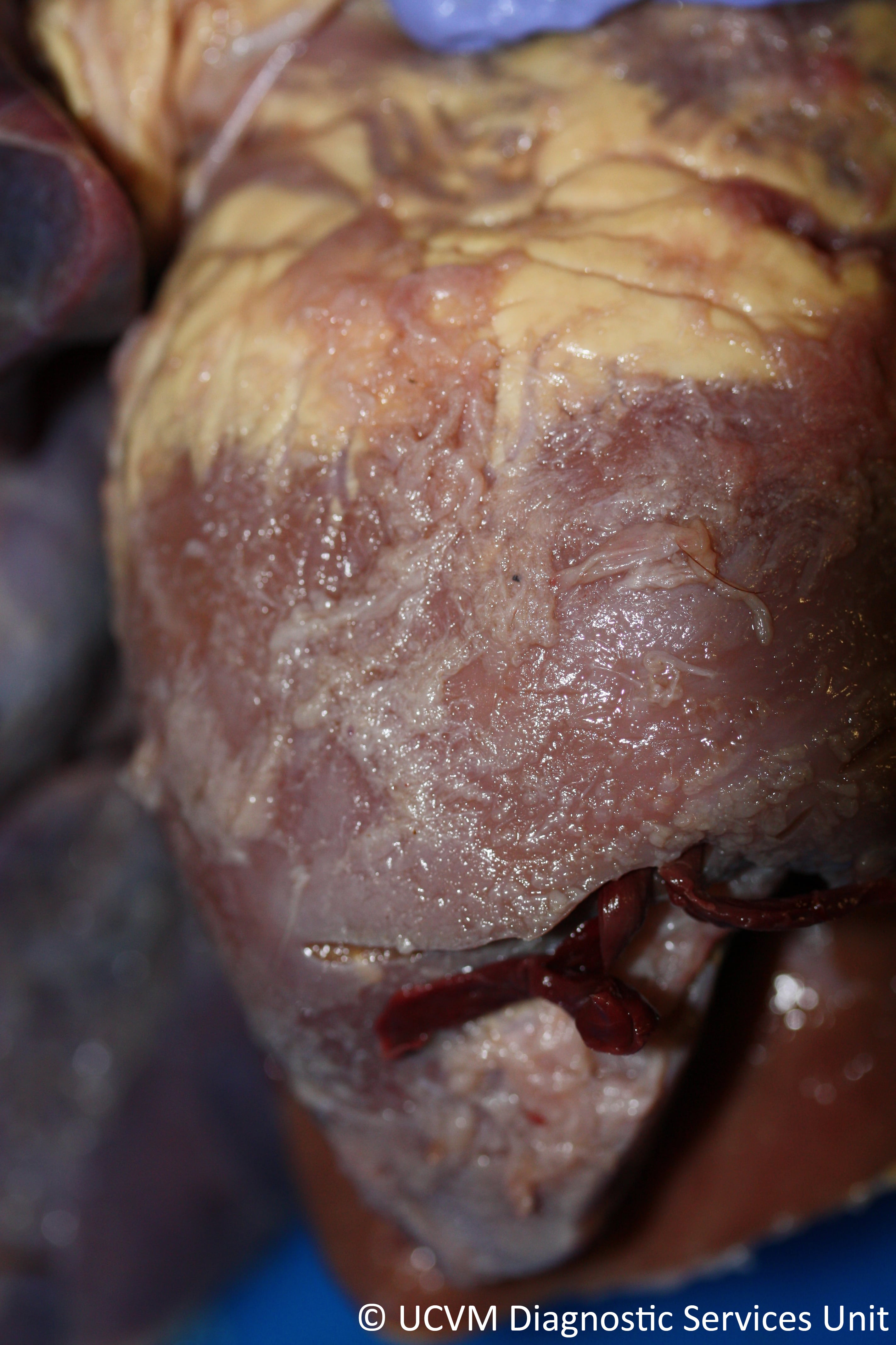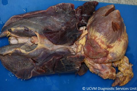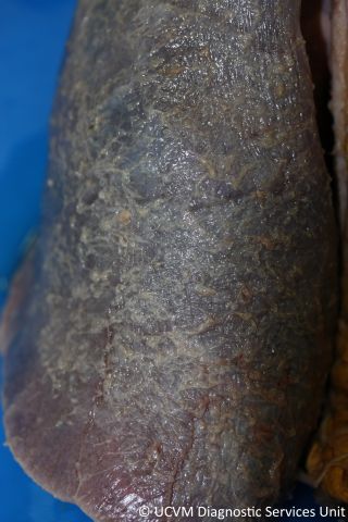 Shown: Fibrinous pneumonia, epicarditis