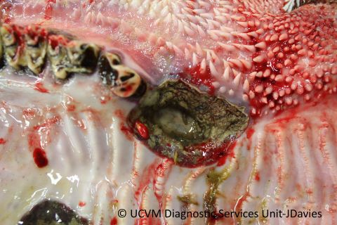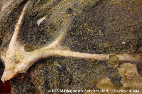 Ruminant, Bovine: Heart. Myocardial necrosis and mineralization (White Muscle Disease) caused by Vitamin E/Selenium deficiency.