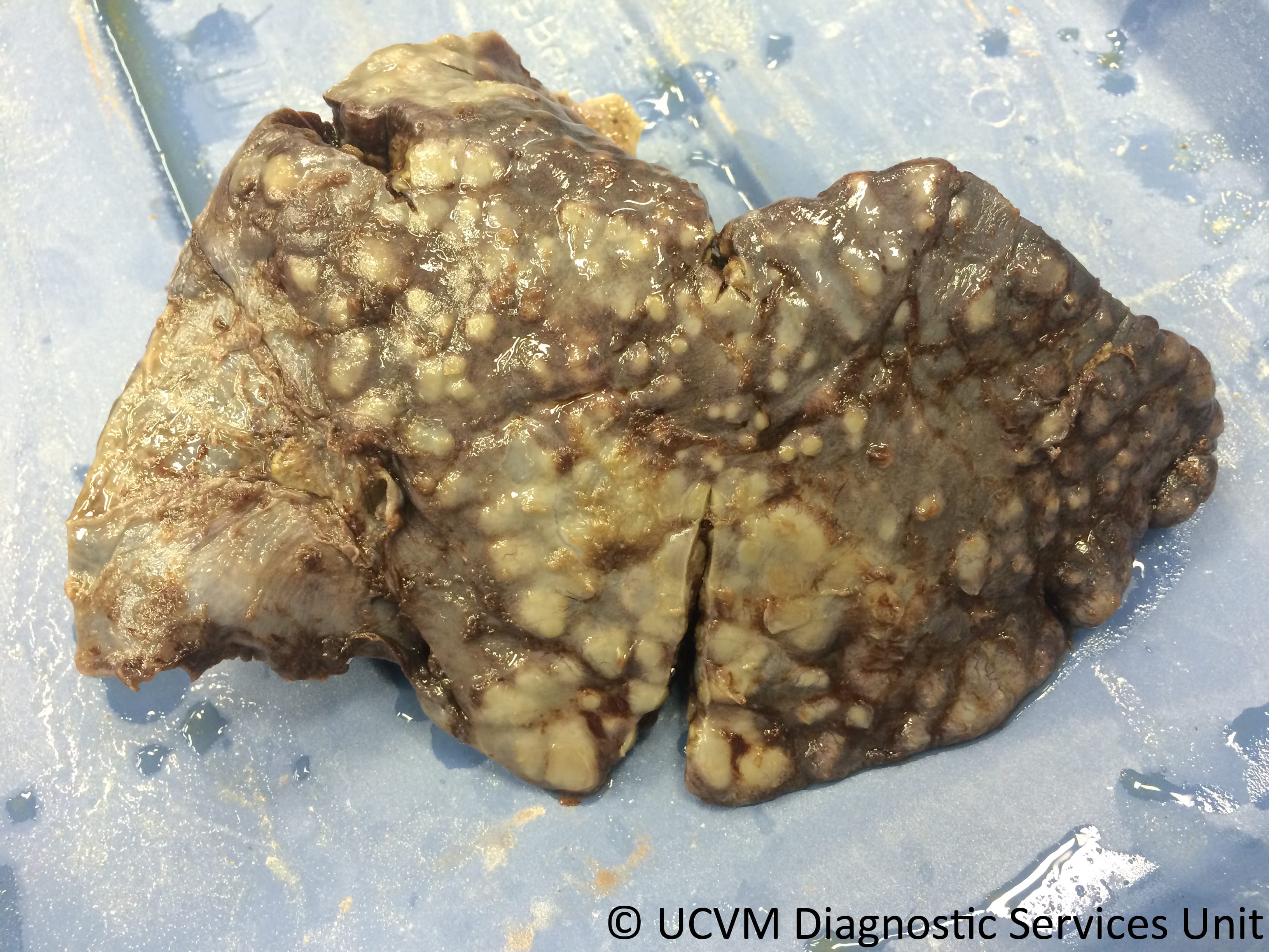 Pneumonia: Firm, plum-coloured cranioventral consolidation with numerous caseonecrotic abscesses and sequestra