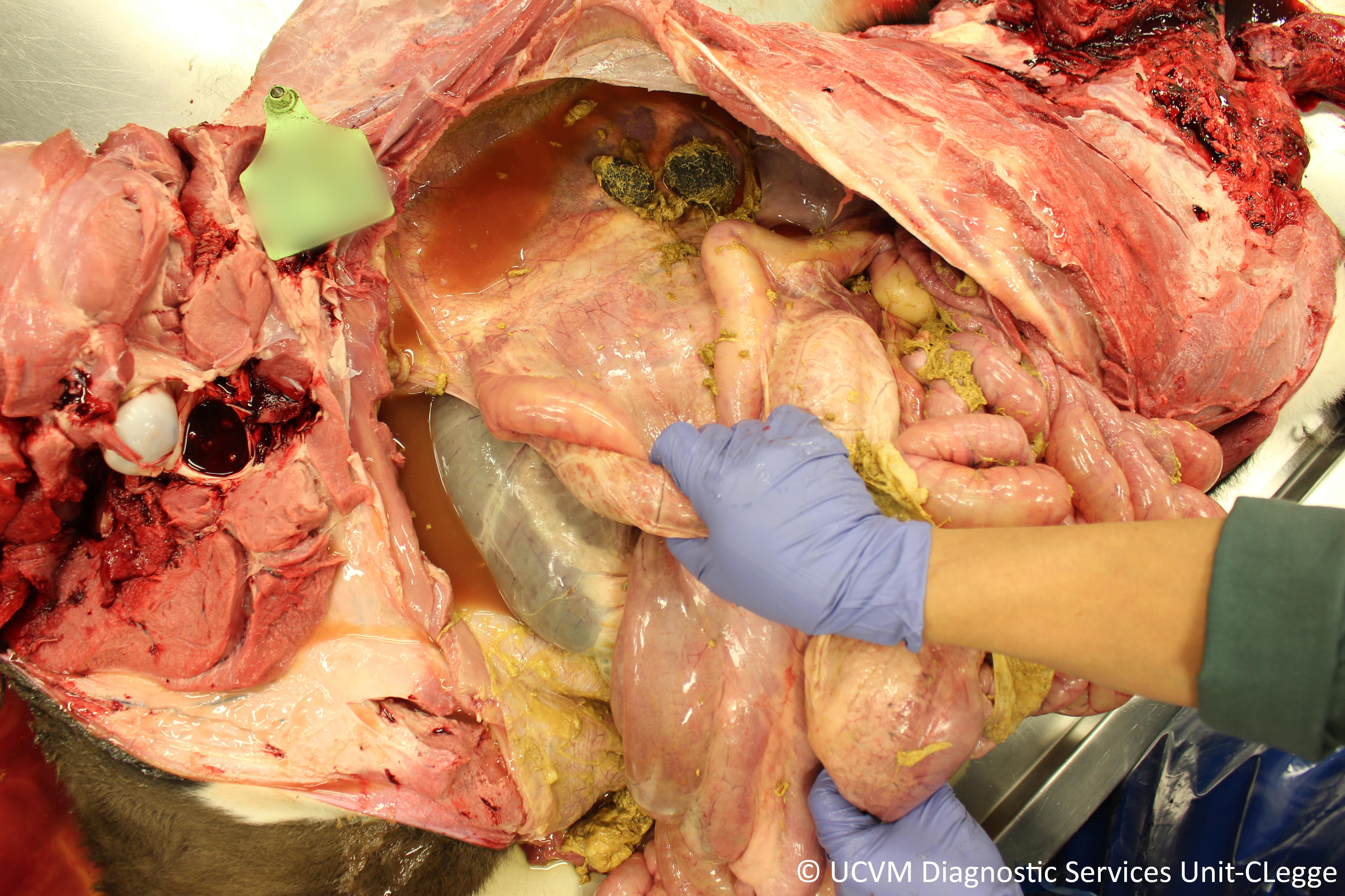 Fibrinosuppurative peritonitis with abomasal content secondary to abomasal perforation