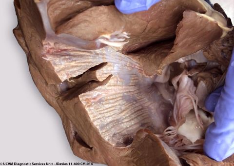 Pneumonia: Firm, plum-coloured cranioventral consolidation with numerous caseonecrotic abscesses and sequestra