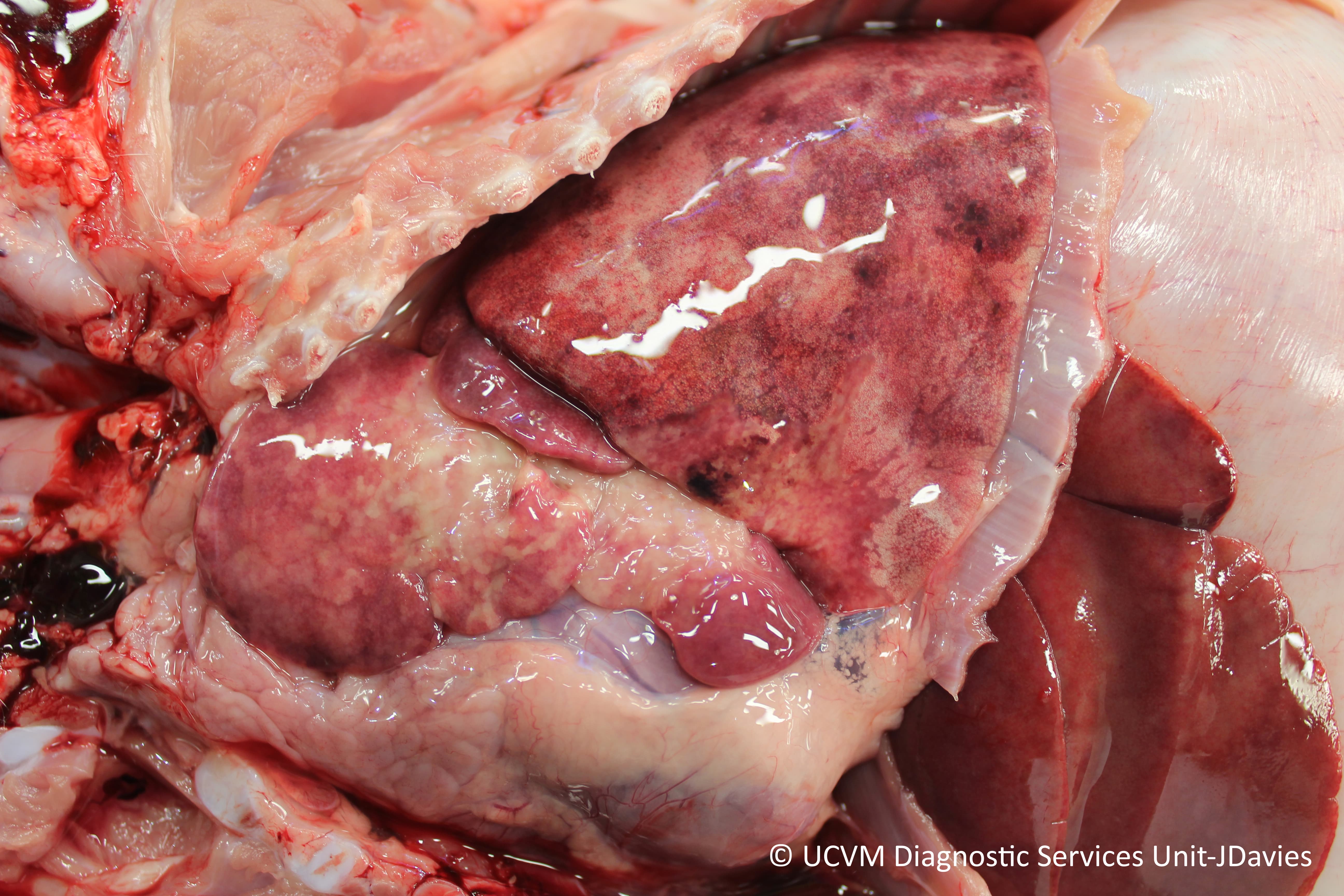 Irregular consolidation in the cranioventral areas, with a firm texture and dark-red or gray-pink colour