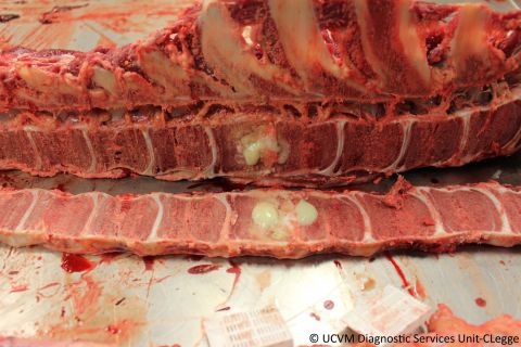 Pneumonia: Firm, plum-coloured cranioventral consolidation with numerous caseonecrotic abscesses and sequestra