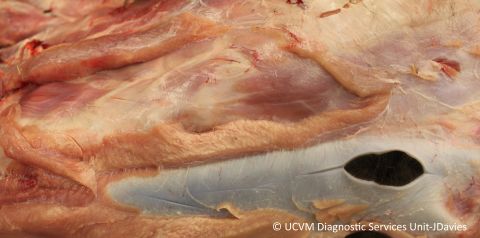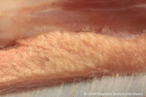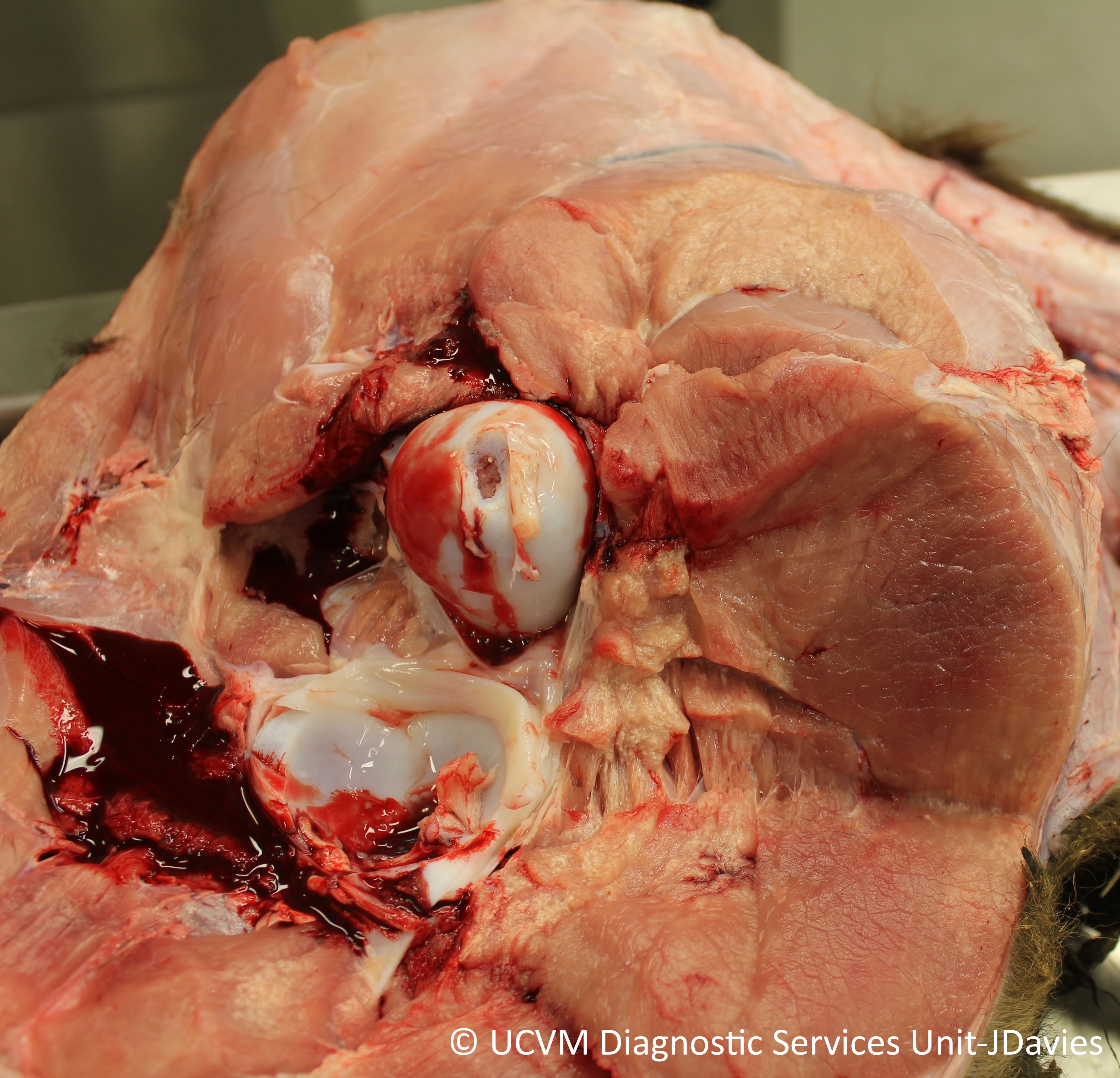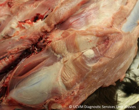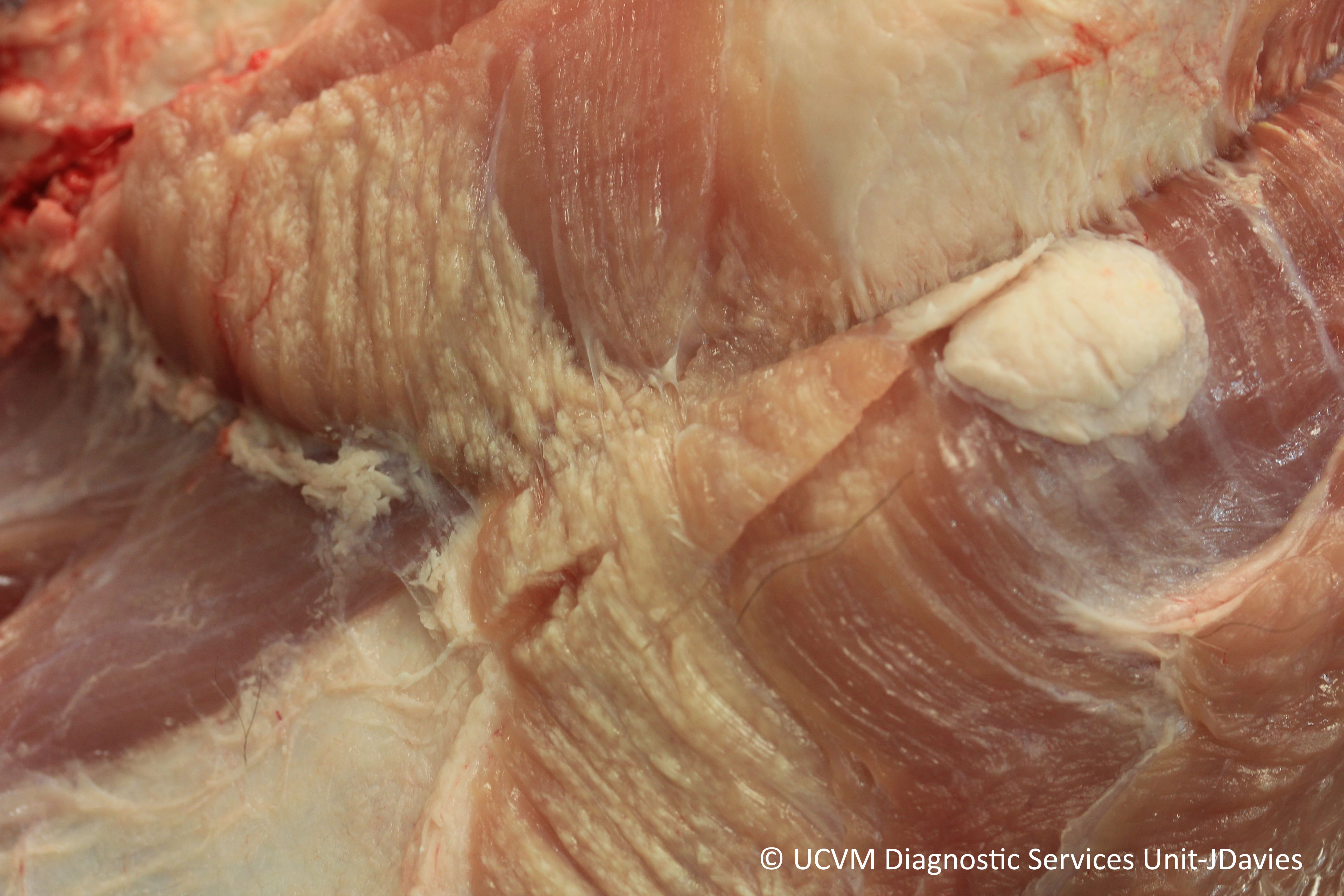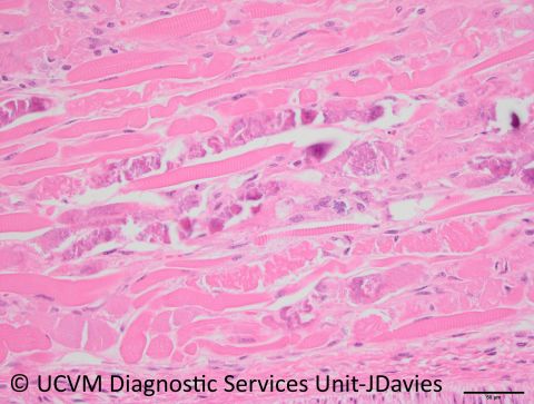Shown: Muscle necrosis and mineralization in White Muscle Disease