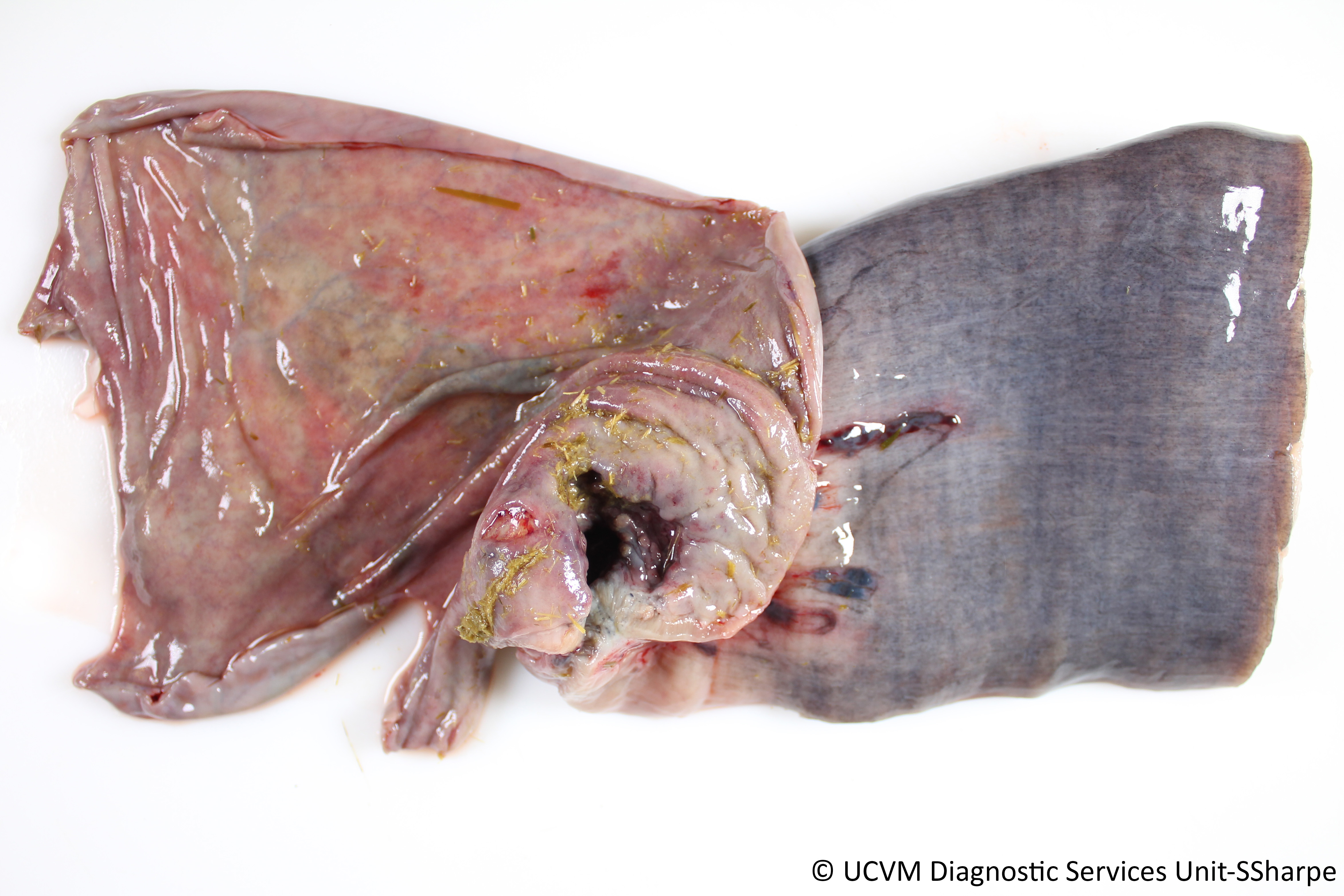 Ruminant, Bovine: Abomasum, forestomach. Emphysematous and hemorrhagic abomasitis, suspect Clostridial abomasitis.