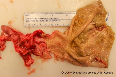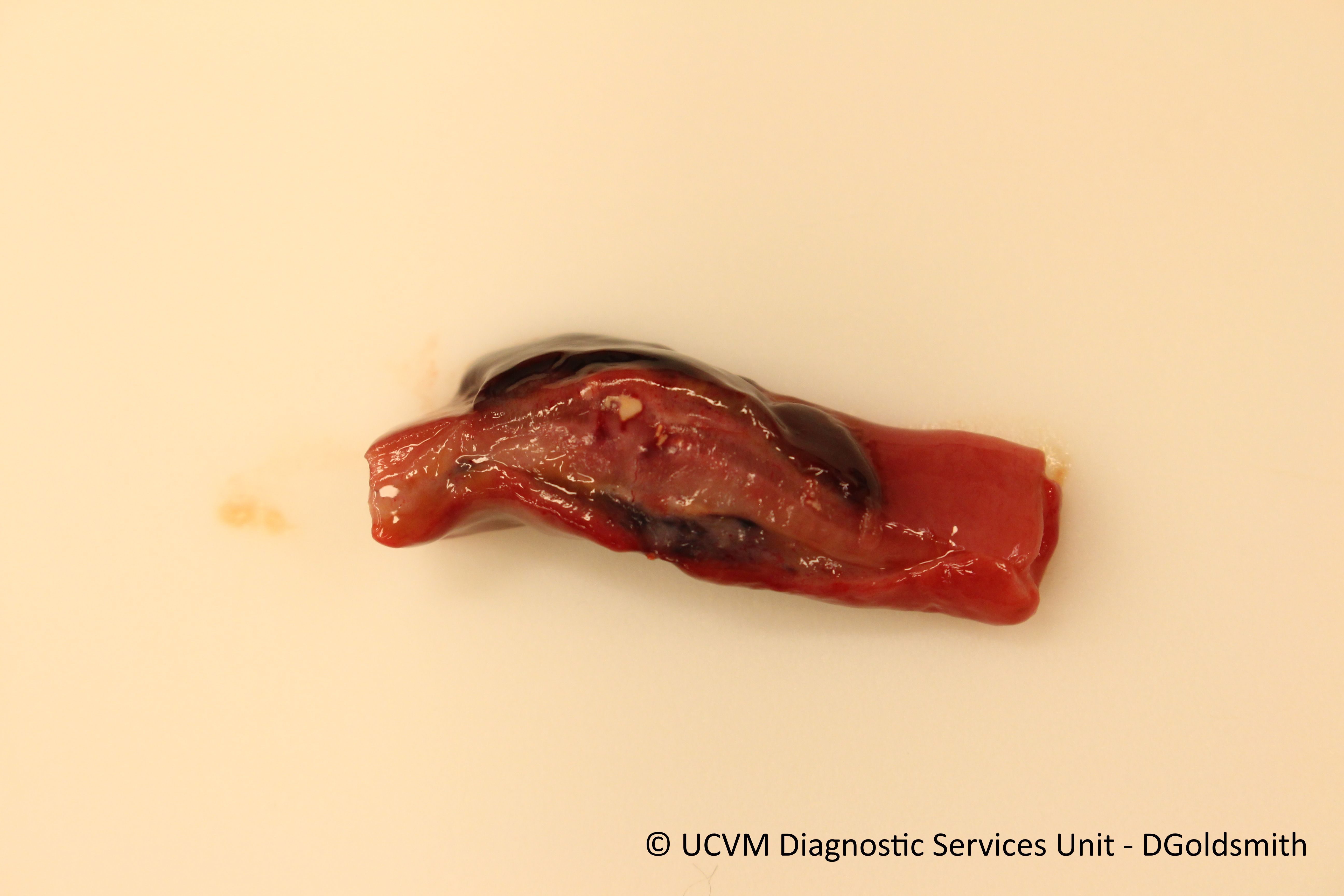 Small intestine, not ileum, with hemomelasma ilei like lesions with focal necrosis