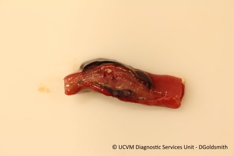 Focal mural inflammation with eosinophilic granulomas suspect secondary to migrating parasites