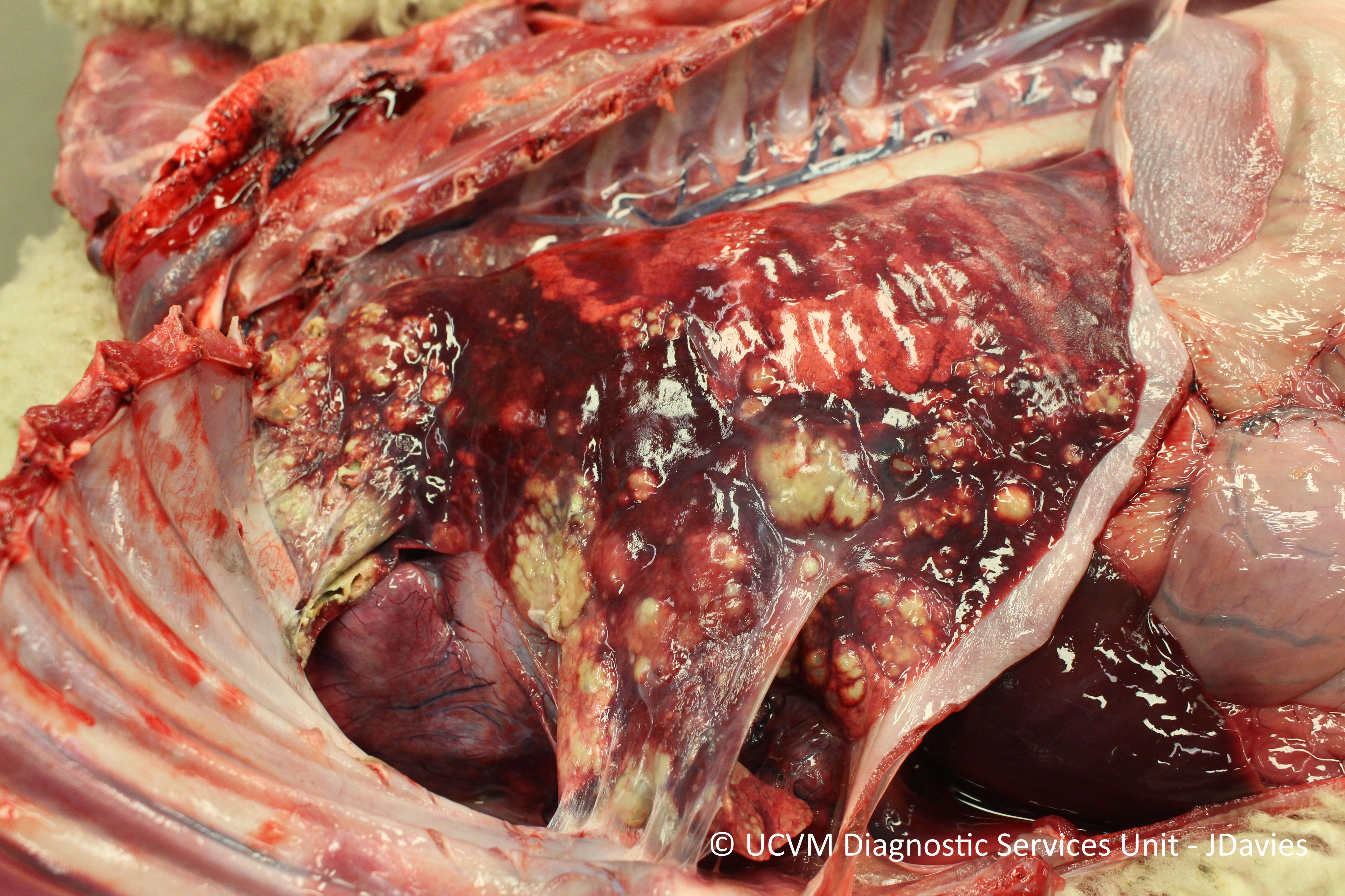 Bronchopneumonia, necrosuppurative, chronic with pleural adhesions; Caused by Mannheimia haemolytica, Mycoplasma ovipneumoniae and Trueperella pyogenes
