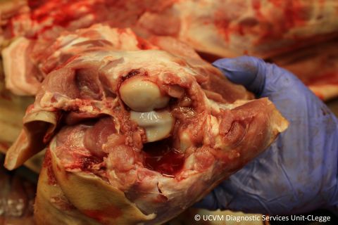 Equid, Horse: Stifle joint, medial femoral condyle. Osteochondrosis, subchondral bone cyst.