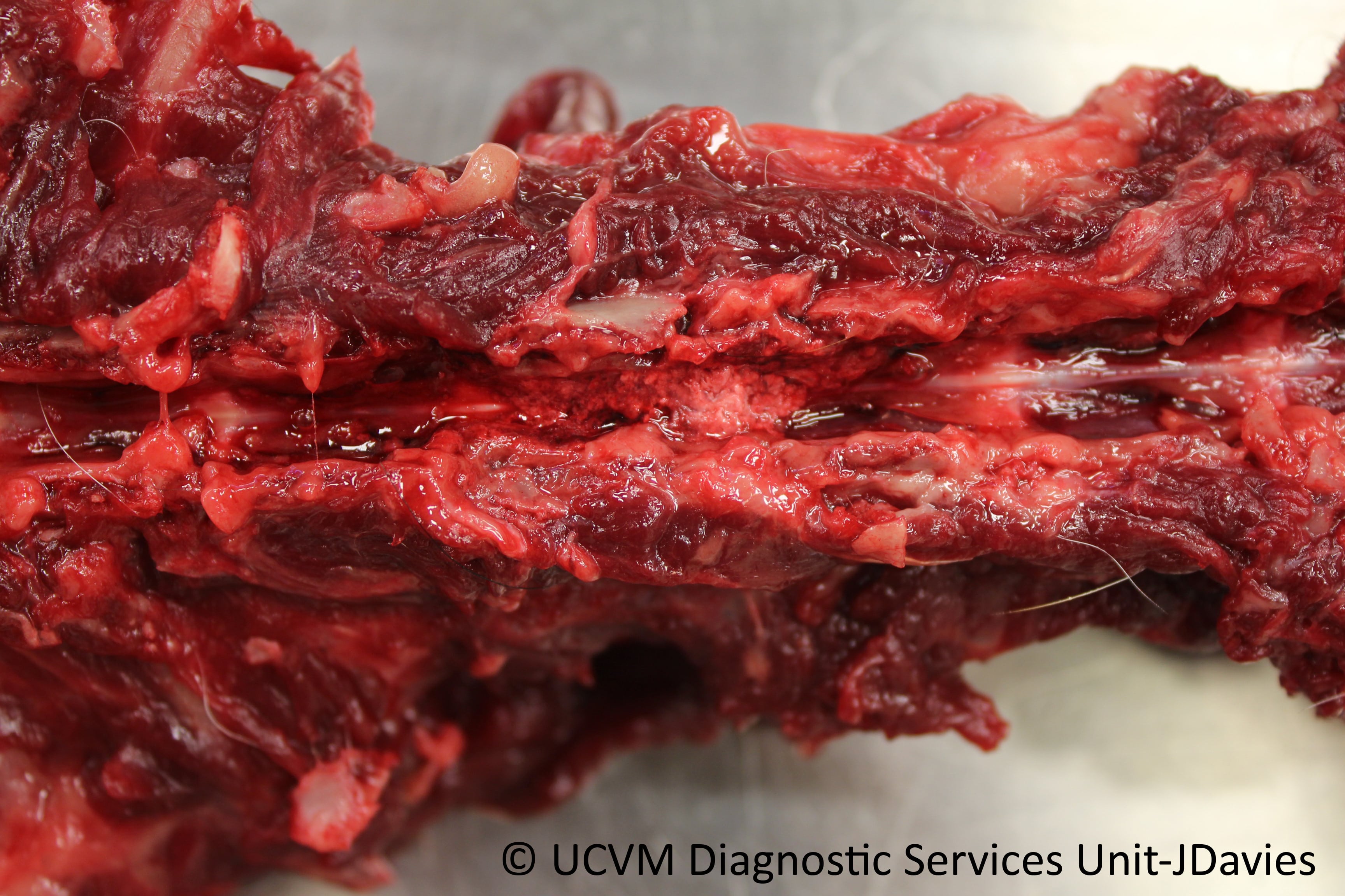 Shown: Intervertebral disk disease, extrusion of calcified disk material