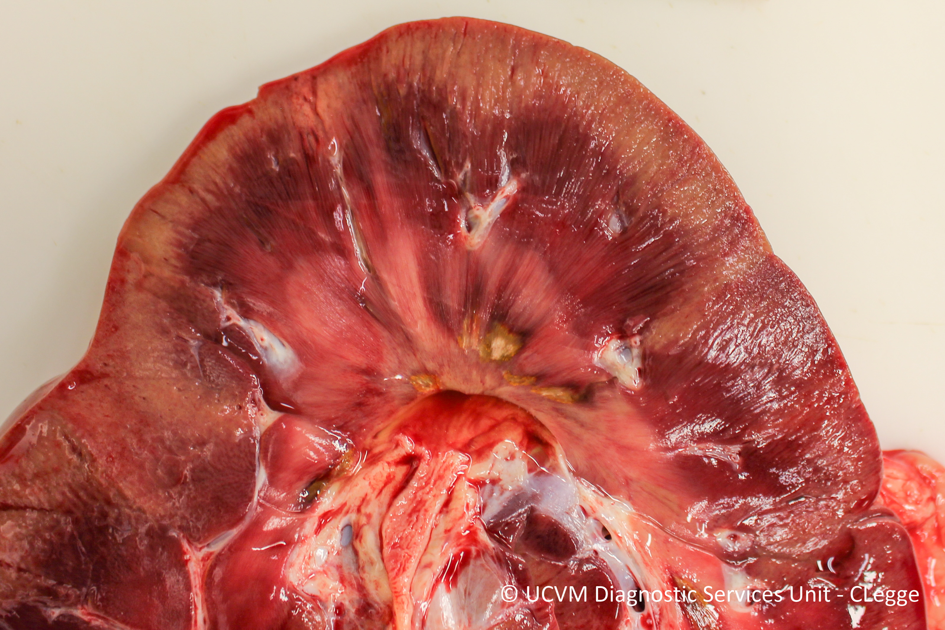 Renal crest necrosis, multifocal to coalescing, acute. Secondary to renal medullary hypoperfusion induced by a combination of colitis (dehydration and hypotension) and NSAID administration (exacerbates hypoperfusion of the renal medulla)