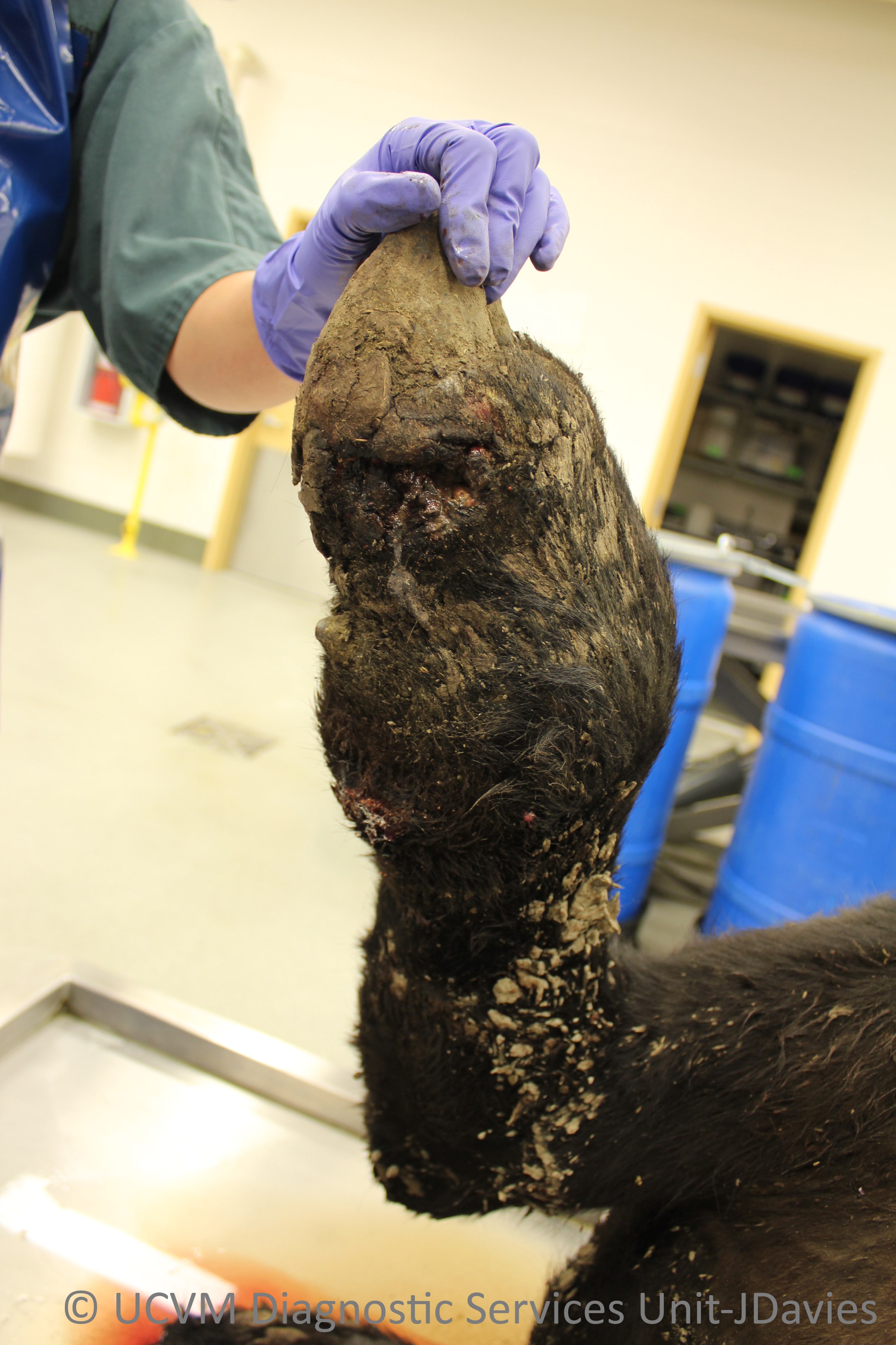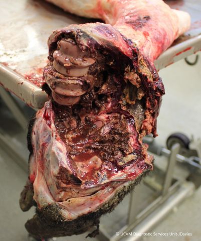 Ruminant, Bovine (calf): Peritoneum. Peritonitis following abomasal perforation in a calf with clostridial abomasitis.