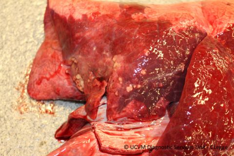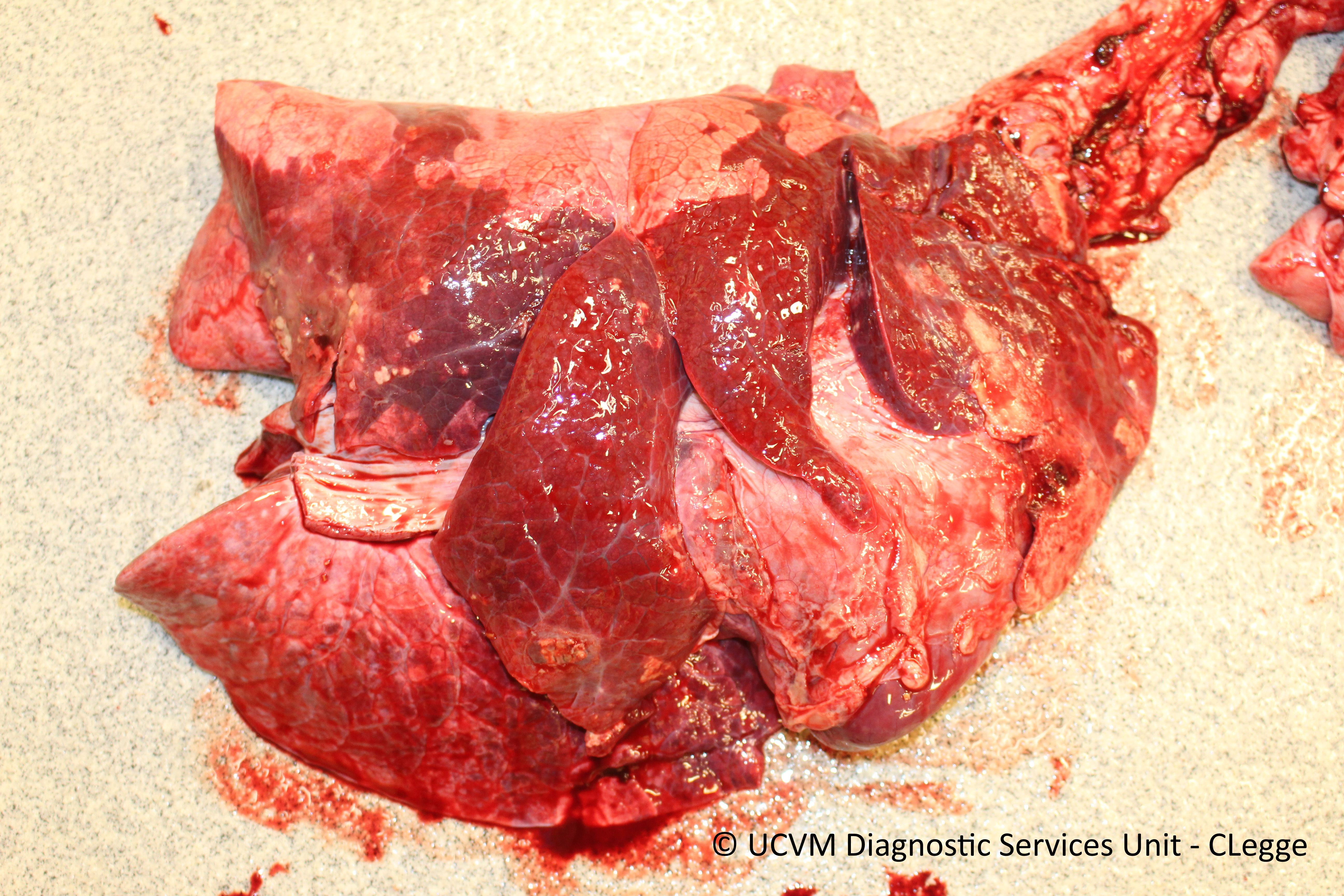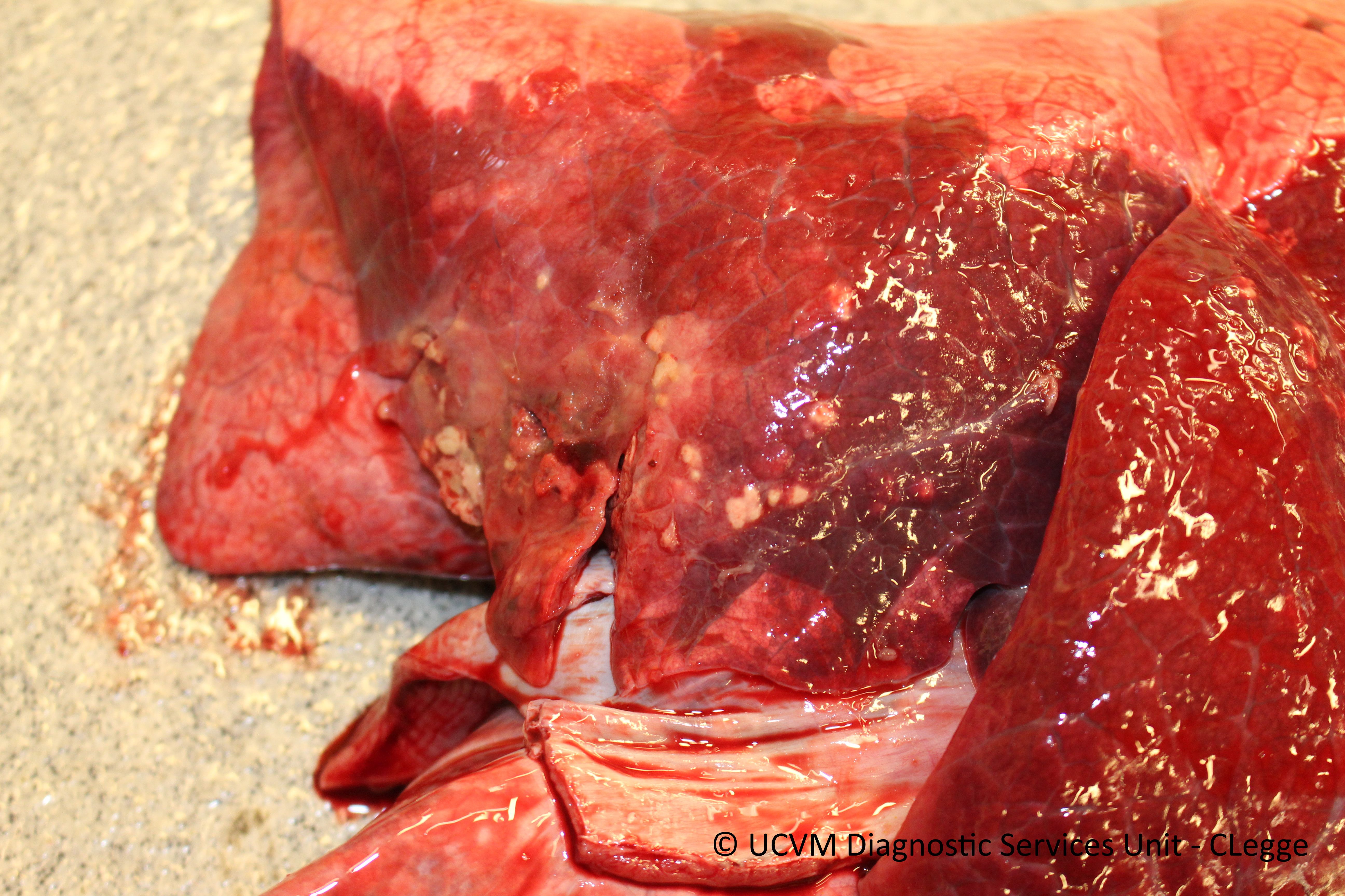 The caudal lobe shows abscesses and pleural change/thickening centered over a focus of pleural adhesion. The lung lesions were associated with a subacute fractures of the right hemimandibule and right 5th rib.