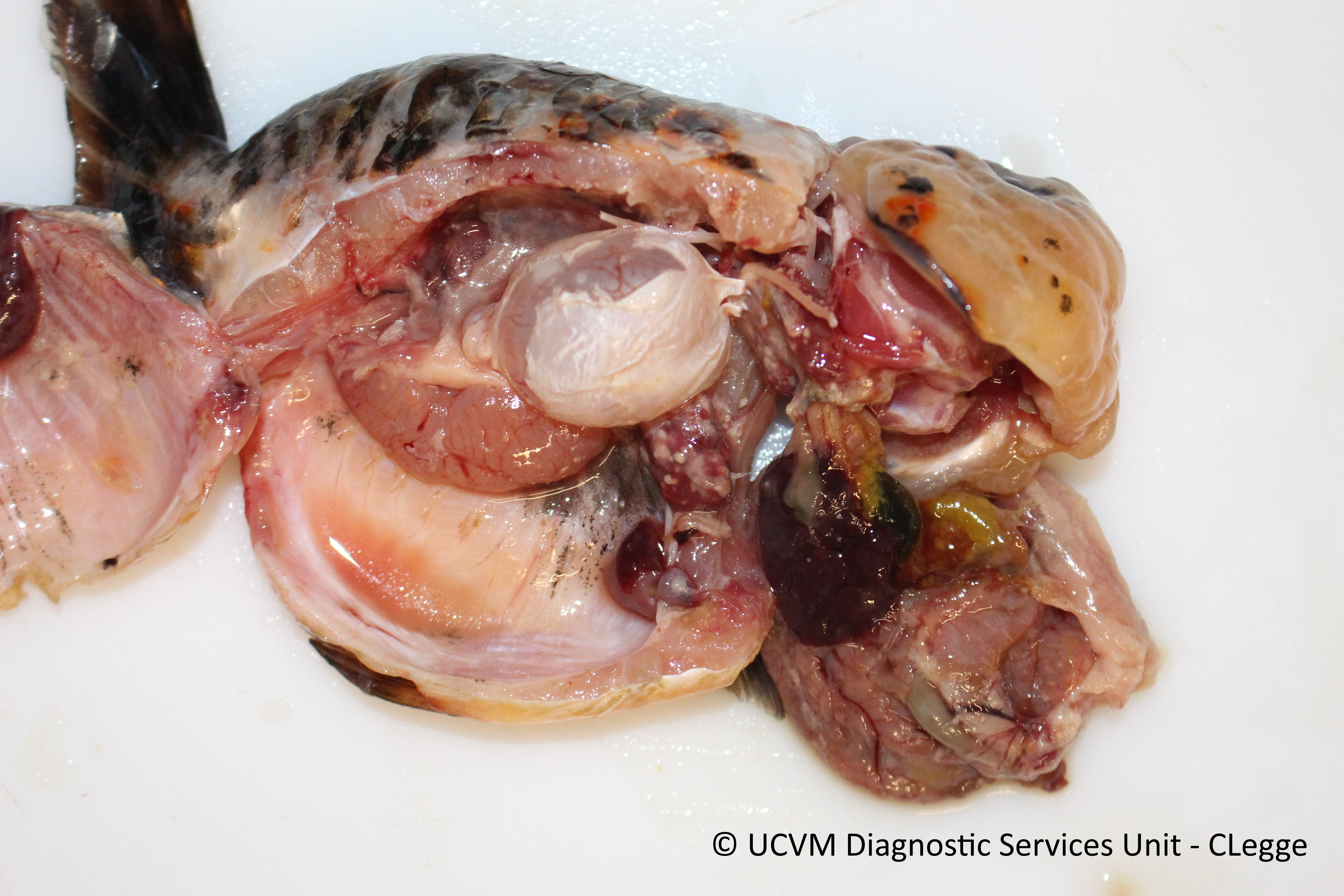 Disseminated granulomas (granulomatous hepatitis, splenitis, nephritis, oophoritis and peritonitis), multifocal to coalescing. Etiology: Disseminated mycobacterial infection with Mycobacterium marinum and Mycobacterium fortuitum.
