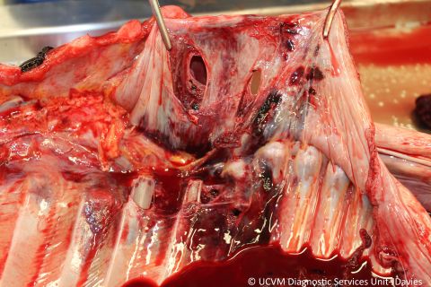 Tracheal and lung lobe laceration (full-thickness), acute, focal with mild to moderate pleural hemorrhage, pulmonary contusions, and pneumothorax (consistent with blunt force trauma; hit by car)
