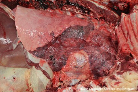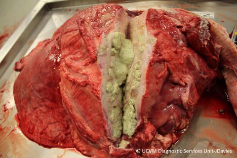 Pneumonia: Firm, plum-coloured cranioventral consolidation with numerous caseonecrotic abscesses and sequestra