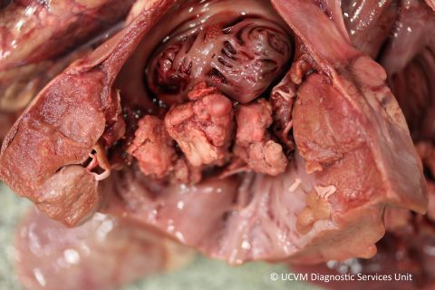 Irregular yellow-red or yellow-gray vegetations on the valve leaflets, with underlying ulcerations