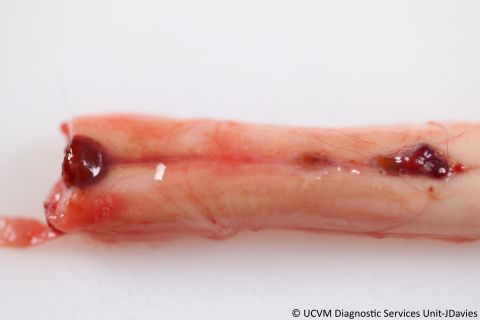 Lesions range from insignificant intimal tracks, to occlusive thrombotic lesions in the cranial mesenteric and ileocecocolic arteries