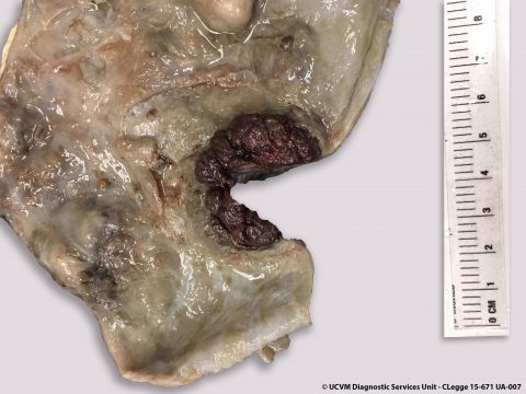 Fibrinous cystitis with proximal urethral obstruction, focal urinary bladder perforation, marked uroabdomen and moderate fibrinous peritonitis