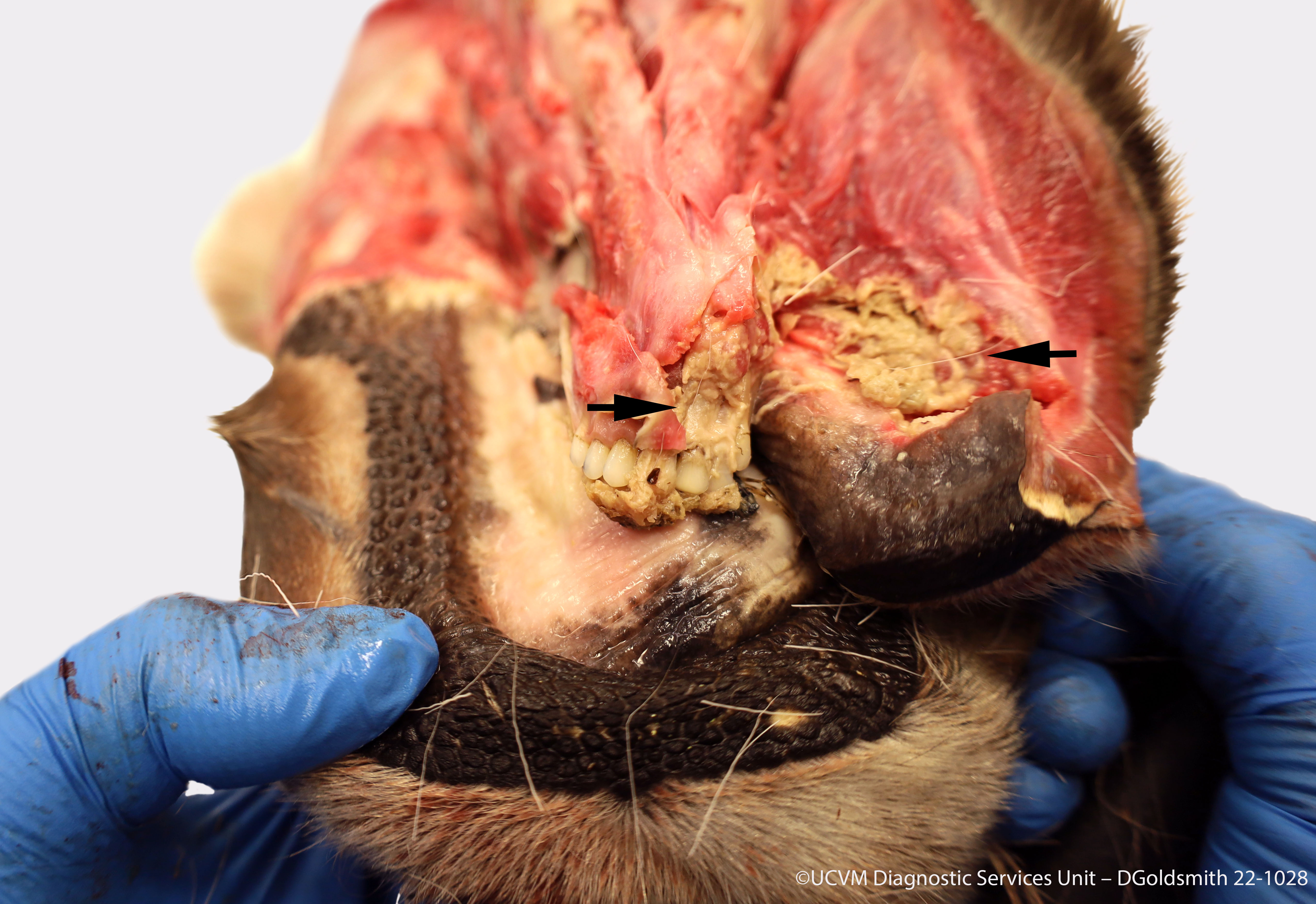Pus was seen around the nose. Embedded in the tissue of the lip are large numbers of small worms that were identified as an Onchocerca spp.
